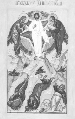 Христос же в некотором отдалении от учеников стал молиться. И вот, во время молитвы неожиданно изменился Его облик: лицо засияло как солнце, одежды стали белыми как снег и также блистали необычайным светом. Этот свет разбудил спящих. Среди ночного мрака потрясенные Петр, Иаков и Иоанн увидели своего Учителя в Божественном величии, Небесной Славе Сына Божия. С изумлением глядя на Него, они заметили рядом с Ним двух мужей – то были великие пророки Моисей и Илия. Появившиеся из невидимого мира, они говорили с Господом о Его грядущих страданиях и