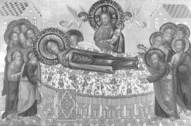 покидает их. Но Она утешала апостолов: « Не плачьте, друзья и ученики Христовы, и не омрачайте Моей радости вашим горем. Я иду к Сыну Моему и Богу вашему, а вы, похоронив Мое тело, возвратитесь каждый к своему делу». Она заповедала похоронить Ее в Гефсимании, там, где были погребены Ее родители, праведные Иоаким и Анна, и обручник Ее, праведный Иосиф. И вот наступил скорбный день. Погруженная в глубокую молитву Матерь Божия возлежала на украшенном ложе. Несмотря на раннее утро, в комнате горело множество свечей. По церковному преданию, кроме