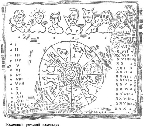 позаимствовали римляне, а позднее – и другие народы Западной Европы. На каменном римском календаре в верхнем ряду можно видеть изображения семи дневных покровителей. На латинском, французском и английском языках дни недели обозначаются так:
