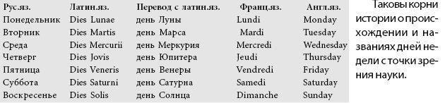 В языках многих народов, в том числе арабском, греческом и других, некотopые (иногда и все) дни «пронумерованы». Например, у славян счет им ведется после воскресенья. Но если, к примеру, на языках народов Прибалтики русскому «понедельник» соответствует название «первый день», «вторник» – «второй день» и так далее, то в греческом, гpузинском, арабском языках это, соответственно, «день с номером 2», «день с номером 3» и т. д. Такая нумерация также берет свое начало в Древнем