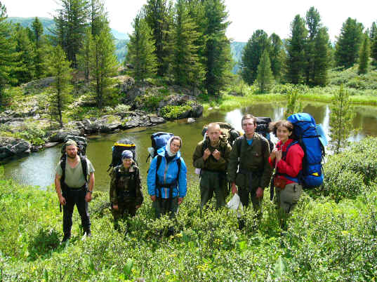 Николай Тетюцкий показывает нам, как правильно ставить палатки, в это время Коля Елизаров занимается разведением костра. Хотя он младший по возрасту, но зато у него самый большой среди нас опыт походной жизни, пока что справиться с этой задачей никто другой не сможет — все топливо подмочено. Затем я, Аня Леонова, отец Иоанн Реморов и Ярослав Старков отправляемся за водой в низину с котелком и пластиковыми бутылками из-под минералки, которыми мы запаслись еще в Новосибирске. В походе с ними удобнее всего: можно сплющить и запихнуть под внешний ремень рюкзака несколько штук.