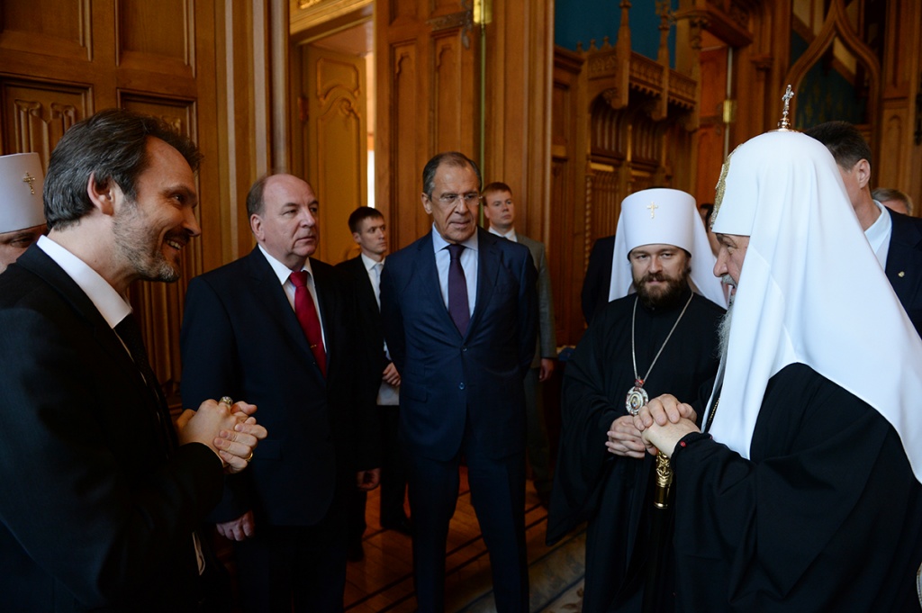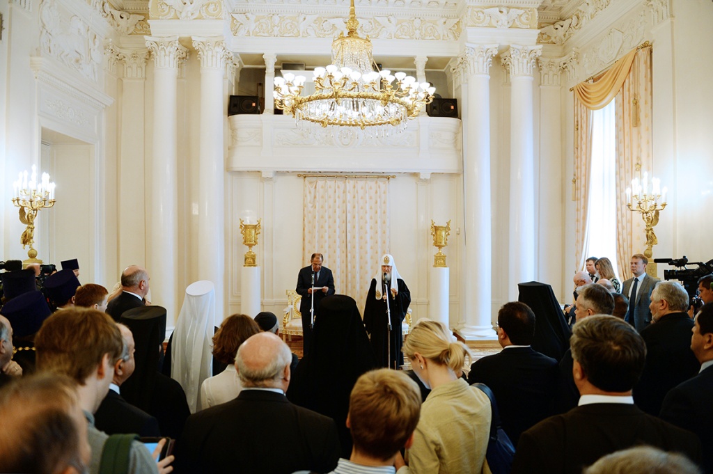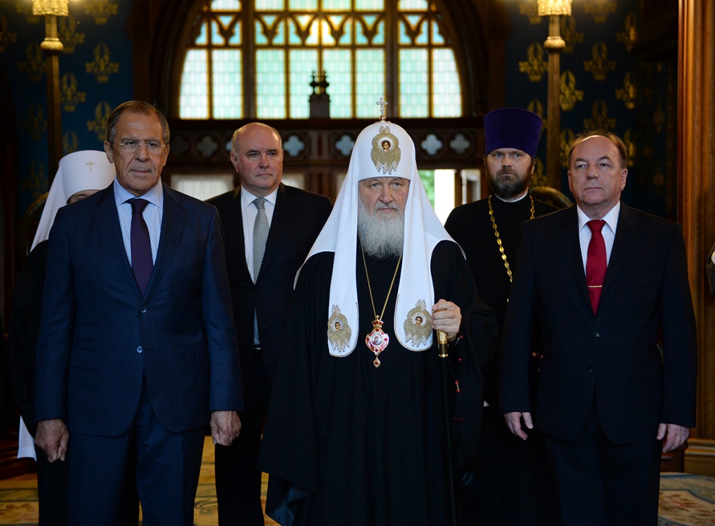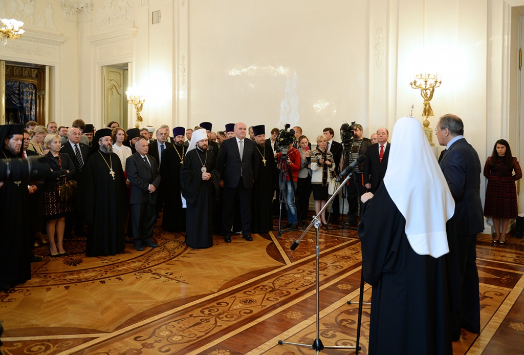 Святейший Патриарх Кирилл: "Миротворческая позиция всегда очень уязвима, потому что чаще всего и одни, и другие этой позицией не довольны"28 мая 2014 года в Москве в Большом особняке Министерства иностранных дел Российской Федерации состоялся торжественный прием по случаю праздника Пасхи. Святейший Патриарх Московский и всея Руси Кирилл обратился к собравшимся со словом. Уважаемый Сергей Викторович, Преосвященные владыки, Ваши Превосходительства, дамы и господа! Я всех бы вас хотел поздравить в последний день, когда мы празднуем Пасху, пасхальным приветствием: Христос Воскресе! Подобные встречи, которые вплетаются в канву пасхальных празднеств, стали для Русской Православной Церкви традиционными. Считаю, что проведение Пасхального приема в министерстве иностранных дел свидетельствует об уровне соработничества между Русской Православной Церковью и российской дипломатией, в каком-то смысле отражая итоги церковно-государственных отношений в нашей стране. Современная международная повестка дня предлагает нам немало тем для совместного обсуждения. Главным церковным событием прошлого года стало празднование в России, Украине и Беларуси 1025-летия Крещения Руси, включавшее в себя принесение в пределы Московского Патриархата Креста апостола Андрея Первозванного, которому поклонились несколько миллионов человек, а также крестный ход с мощами святого равноапостольного князя Владимира, прошедший по России от Владивостока до Калининграда, а затем по Украине и Беларуси. В торжествах участвовали все Поместные Православные Церкви на уровне руководства Церквей или на уровне представителей Синодов; в трех столицах братских славянских стран были совершены Божественные литургии при огромном стечении народа. Я бы хотел поблагодарить МИД России за поддержку в организации и проведении столь масштабных и поистине исторических празднеств, которые еще раз дали всем нам возможность понять и прочувствовать глубину духовных связей между народами России, Украины и Белоруссии, осознать то, что единый источник нашей цивилизации, нашей культуры, нашей веры — Киевская купель крещения — актуализируется и сегодня в тесном взаимодействии на уровне людей, семей и, до недавнего времени, на уровне государства. То празднование было неким апофеозом нашего духовного и культурного единства. Главы Православных Церквей приняли совместное заявление о положении христиан на Ближнем Востоке, текст которого был ими передан во время встречи в Кремле Президенту Владимиру Владимировичу Путину, что свидетельствует о признании в православном мире особой роли Российского государства. Вот и сегодня я только что принимал Патриарха Ассирийской Церкви, который приехал в Москву с единственным заявлением, суть которого сводится к тому, что Россия и Русская Церковь — сегодня главная и основная надежда и опора христиан, живущих на Ближнем Востоке. Патриарх сказал так: «Мы не видим больше ни одной силы и ни одного центра, который реально мог бы помочь христианам, который сегодня реально проявляет активную позицию в защите христианского присутствия не только на уровне деклараций и заявлений, но и на уровне практических действий». И здесь я опять хотел бы сердечно поблагодарить МИД, а также целый ряд российских общественных организаций, которые во взаимодейст