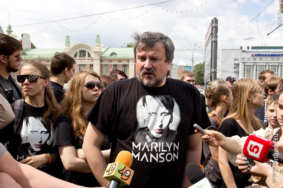 Сотни жителей Новосибирска провели митинг против концерта МэнсонаСотни жителей Новосибирска собрались 11 июня на площади Ленина на митинг в защиту нравственности, на котором требовали отмены концерта Мэрилина Мэнсона, — защитники американской рок-звезды не смогли подойти к сцене. Около сцены активисты развернули плакаты «Прекратите растлевать наших детей. Долой Мэрилина Мэнсона», «Нет провокациям под видом культуры» и др. Ораторы призывали протестовать против «разврата» и «западных ценностей», а помимо осуждения творчества Мэнсона высказались против абортов, Саши Грей, выставки современного искусства «Родина» и даже против строительства в Крыму игорной зоны. Около 40 защитников Мэрилина Мэнсона во главе с организатором концерта рок-исполнителя в ЛДС 29 июня, руководителем агентства «Сибирские гастроли» Виктором Захаренко собрались около входа в метро — представители полиции не пустили их к сцене у оперного театра «из соображений безопасности». «[Если концерт отменят], мы навсегда войдем в анналы истории как город, в котором запретили великого Мэрилина Мэнсона», — высказался Виктор Захаренко, добавив, что перенос концерта на 30 июня возможен, только если это позволит график артиста. Драк между защитниками и противниками Мэнсона не случилось, конфликты возникали в формате дискуссий и небольших стычек.