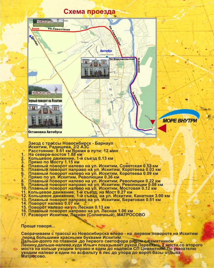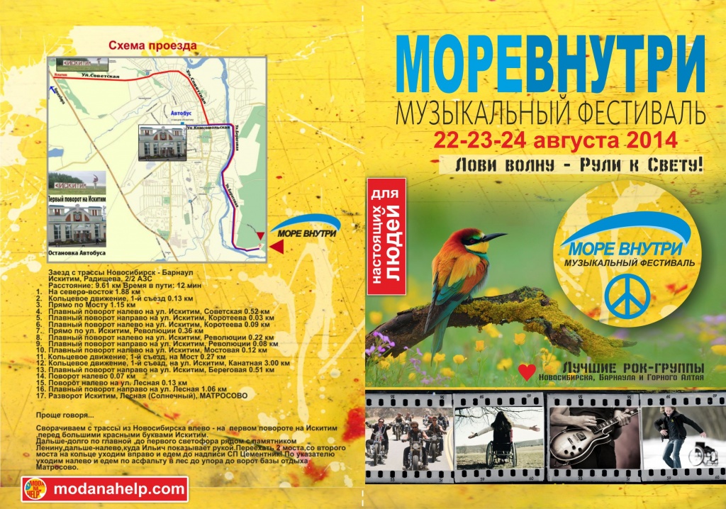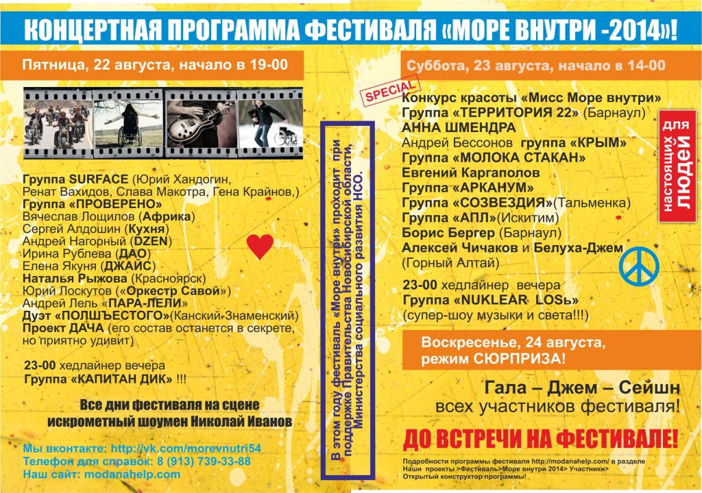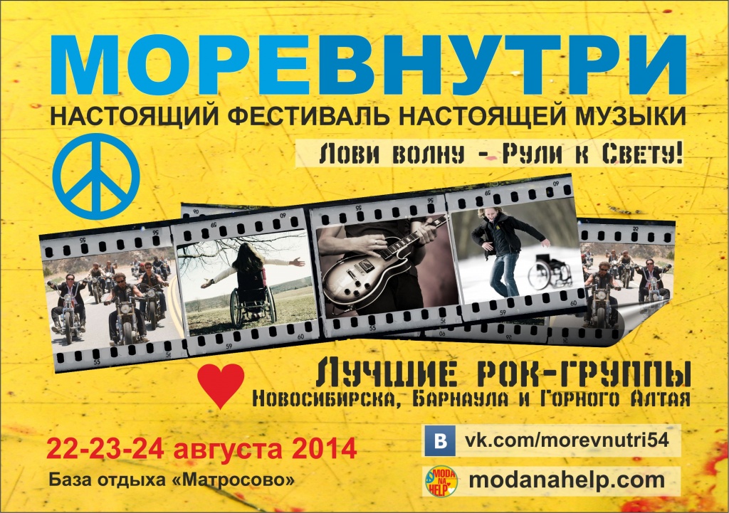 Фестиваль «Море внутри — 2014»С 22 по 24 августа на базе отдыха «Матросово» в Искитимском районе пройдет фестиваль для людей с инвалидностью «Море внутри 2014». В этом году фестиваль пройдет в поддержку колясочников Юго-Востока Украины.