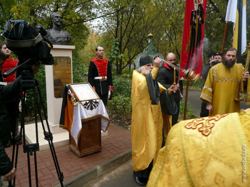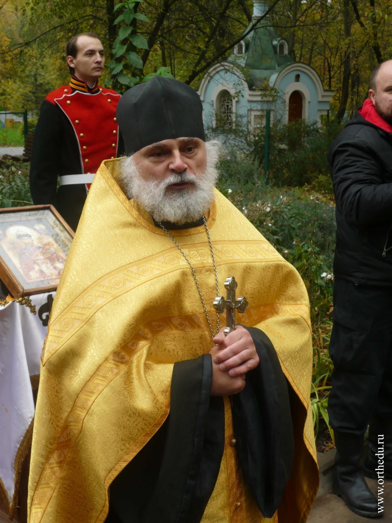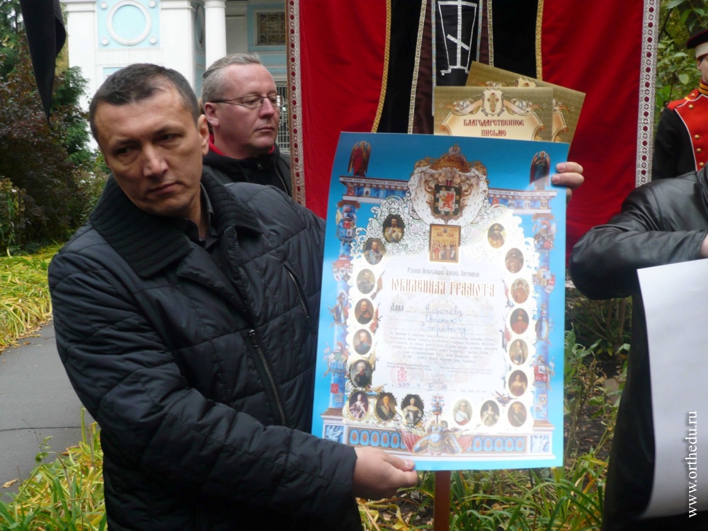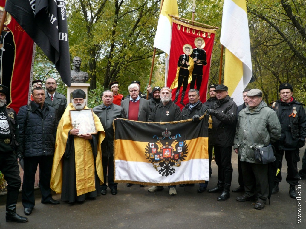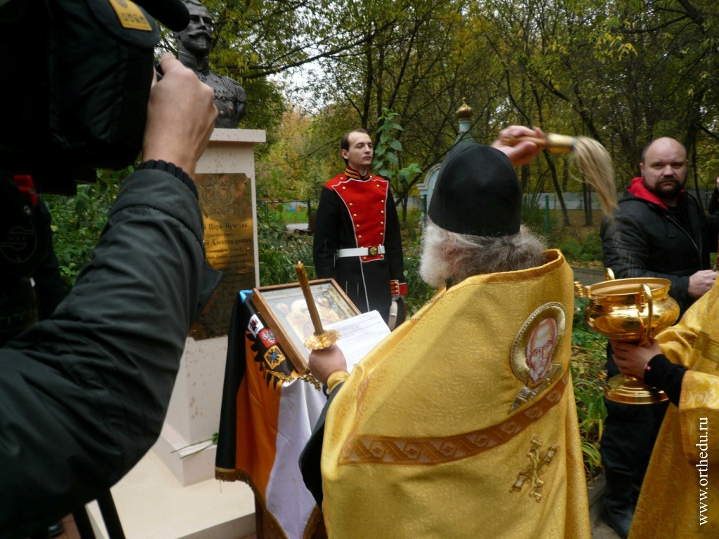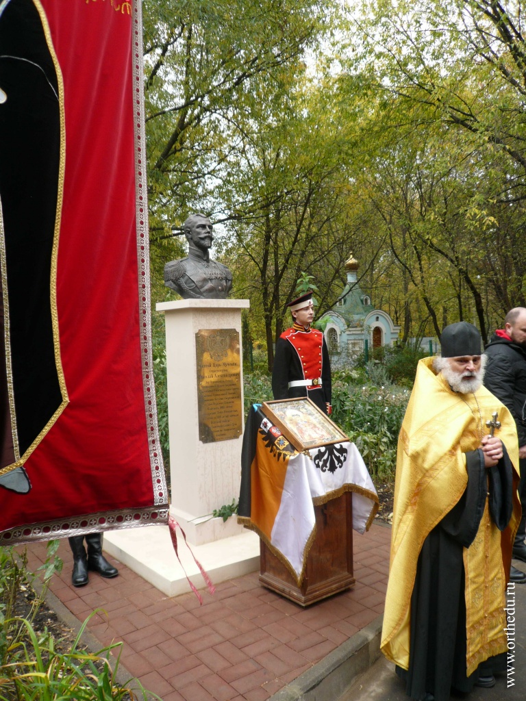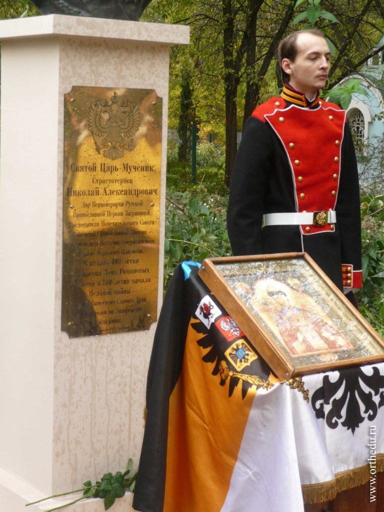 Почетный караул в парадной форме Лейб – гвардии Измайловского полка был выставлен от Союза потомков Измайловцев. Советник Первоиерарха Русской Православной Церкви Заграницей, начальник Войсковой Православной Миссии Игорь Евгеньевич Смыков зачитал письмо Владыки Илариона: Настоятелю Храма Сошествия Святого Духа на Лазаревском кладбище Игумену Сергию (Рыбко). Дорогой о Господе отец Сергий! В память 400 - летия воцарения в России Дома Романовых и Столетия начала Великой войны, передаю Храму Сошествия Святого Духа на Апостолов на б. Лазаревском кладбище бюст Святого Страстотерпца Царя - Мученика Николая Второго. Бронзовая скульптура создана по проекту Вячеслава Михайловича Клыкова скульптурной мастерской ООО "Артпроект". Пусть этот дар послужит укреплением единства нашей Церкви и покажет нашей пастве добрый пример любви и почитания Святого Страстотерпца Царя - Мученика Николая и Святой Царской Семьи. С Божиим благословением, Первоиерарх Русской Православной Церкви Заграницей Митрополит Восточно - Американский и Нью - Йоркский Иларион, Председатель Попечительского Совета Войсковой Православной Миссии Затем Глава Православной Миссии вручил церковно – общественные награды: Юбилейной грамоты за подписью Первоиерарха РПЦЗ митрополита Илариона – «Во внимание к многолетнему, усердному и спасительному служению Русской Православной Церкви, верность историческим традициям Российской Имперской Государственности, за личные заслуги перед Русским народом, активную жизненную позицию в отстаивании интересов нашего Отечества – Царской России, а также в ознаменование 400-летия преодоления Смуты и 400-летнего юбилея воцарения Дома Романовых» - были удостоены творческий коллектив ООО «Артпроект» и его руководитель Евгений Егорович Королев. Среди последних работ этой организации – не так давно открытые в Москве памятники Атаману Платову и Святому Князю Дмитрию Донскому, готовится открытие в США , а также Москве и Курске Памятника Объединению Русской Православной Церкви, готовятся многие другие важные в духовном и историческом значении памятники и монументы. Юбилейная медаль с ликом Государя «В память Великой войны» - «За многолетние миссионерские и просветительские труды, любовь к Богу, верность Царю и Отечеству» - была вручена настоятелю храма Сошествия Святого Духа игумену Сергию (Рыбко), заместителю Главы Союза Православных Хоругвеносцев Владиславу Васильевичу Куроптеву, хранителю Чудотворной мироточивой иконы Царя Николая врачу – хирургу Олегу Ивановичу Бельченко. Посмертно данная награда выписана известному церковному и общественному деятелю Юрию Николаевичу Агещеву и передана на хранение в храм Сошествия Святого Духа, где многие годы Юрий Николаевич был помощником настоятеля. На торжество была принесена Чудотворная мироточивая икона Царя Николая, которая обильно мироточила и благоухала. Сия святыня находится под особым попечением Первоиерарха Русской Православной Церкви Заграницей митрополита Илариона. Торжественная часть завершилась дружественной праздничной трапезой. Мероприятие было организовано Войсковой Православной Миссией при деятельном участии Союза Православных Хоругвеносцев, Всероссийского Монархического Центра, коллектива Союза потомков Измайловцев.