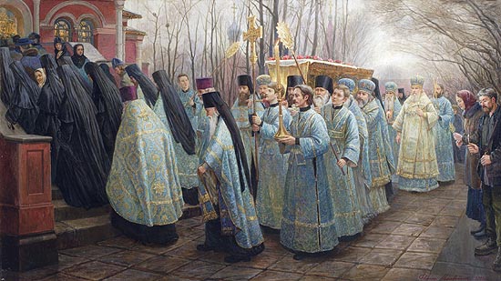 Перенесение мощей патриарха Тихона или Благовещение в Донском монастыре. Художник: Ф. МосквитинНесмотря на то что в склепе была очень высокая влажность, тело Патриарха Тихона, пролежав в земле шестьдесят семь лет, сохранилось почти полностью. Примечательно, что одна из панагий — наперсных икон, символов архиерейской власти, покоившаяся на груди святителя Тихона, была сделана из кости мамонта, но полностью превратилась в прах. Остался только серебряный оклад. Нам тогда невольно вспомнилась строка из Псалтири: «Хранит Господь вся кости их». Хотя сохранились не только кости святого Патриарха, но и большая часть тела. А также великий патриарший параман, четки, монашеский параман, нательный крестик, драгоценная золотая панагия, подаренная, еще в бытность Патриарха архиепископом Ярославским духовенством и прихожанами этой епархии. Обнаружилась даже ветка вербы (святителя Тихона хоронили на Вербное воскресенье) и флакончик с благоухающим розовым маслом, которое возливали на тело Патриарха перед погребением. *** Через некоторое время наш археолог Сергей Алексеевич Беляев все-таки докопался и до разгадки, почему на лжемитрополите Александре Введенском оказались патриаршие облачения. На фабрике Оловянишниковых их сделали не одно, а два. Теперь то из них, которое действительно принадлежало святителю Тихону, выставлено в музее московского Донского монастыря. Архимандрит Тихон (Шевкунов) 17 ноября 2012 года http://www.pravoslavie.ru/put/57507.htm