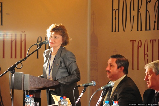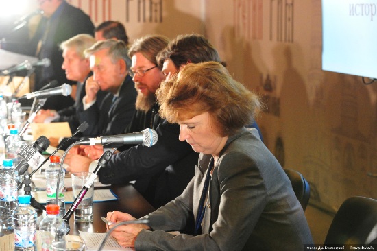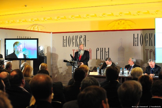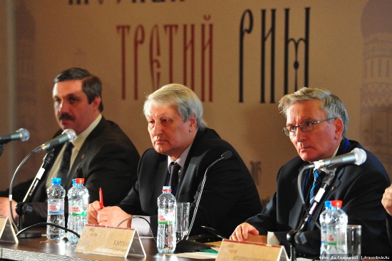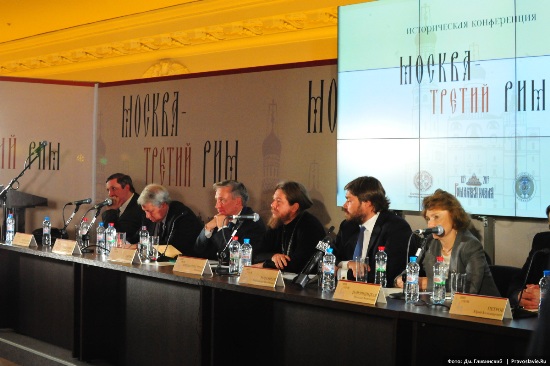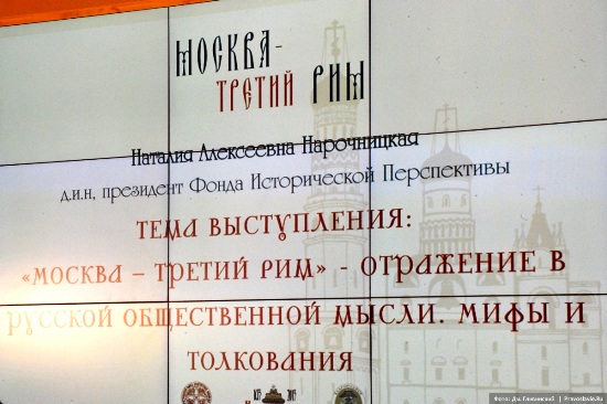 Открыл конференцию доклад президента фонда Исторической перспективы Наталии Нарочницкой «"Москва – Третий Рим”. Отражение в общественной мысли. Мифы. Толкования». Н. Нарочницкая отметила: – Сегодня Запад постоянно использует концепцию «Москва – Третий Рим» в качестве идейной основы русского империализма. На самом деле развитие русской государственности от Московского царства, а потом к империи неразрывно шло вместе с духовным осмыслением самого этого понятия как служения прежде всего. Тем не менее, западная историография XX века заполнена клише о том, что большевизм вытекает из природы истории России. Хотя великий консерватор Освальд Шпенглер однозначно написал: «Победивший в России дух исходит не из Москвы. Родина большевизма – Западная Европа. Демократия XIX века – это уже большевизм». Но либеральная мысль побуждает искать истоки революционного деспотизма именно в концепции монаха Филофея, который якобы зовет к мировому господству. И сегодня миф о «филофействе» как программе «русского и советского империализма» представляет штамп в либерально-западнической литературе, и даже в постсоветской России. Так, К.С. Гаджиев в очень объемной и в целом очень серьезной академической книге повторяет клише, будто бы учение «Москва – Третий Рим» послужило основой территориального формирования Российской империи. Такой подход отражает непонимание равно принадлежащего как восточному, так и западному христианству учения о Риме, о Царстве. Это одно из глубочайших учений о связи духовной, вселенской и земной истории, которое не разделяет, но, наоборот, подтверждает эсхатологическое единство Востока и Запада христианской ойкумены. Поэтому в старину идея и весь комплекс понятий о «всемирной империи» принадлежали вовсе не светскому, политическому, но религиозному мировоззрению, и это отражает именно учение о спасении. Первые сочинения и интерпретация видений пророка Даниила и его толкований сна царя Навуходоносора о четырех царствах, последнее из которых – царство антихриста, первые зачатки учения о Риме как царстве Христианской Истины пронизаны вовсе не идеей мирового господства, или торжества, или превосходства, а спасения и относятся к эсхатологической литературе. А. Карташев говорит, что в эсхатологическом сознании христиан «Римская империя становится рамой, сосудом, броней и оболочкой вечного царства Христова и поэтому сама обретает некоторое символическое подобие этой вечности в истории». Наряду с историографическим значением, Рим как императорский и царский град, где совершается всемирно-историческая борьба добра и зла, вошел в символику христианского художественного сознания. И такое понимание встречается не только в духовной, но и в светской литературе. Рим стал аллегорией мистического центра, оплота всемирно-исторической борьбы добра и зла, от выстраивания которого зависит конец мира. Римом в болгарских хрониках именуется Тырново, Римом называл Кретьен де Труа Францию, в стихах Тирсо де Молина Толедо становится «Римом, императорским градом».
