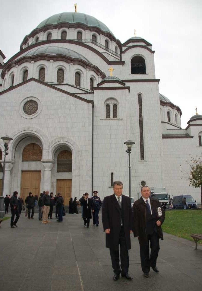 По завершении приема Святейший Патриарх Кирилл отбыл в аэропорт г. Белграда, где его провожали Святейший Патриарх Сербский Ириней, Чрезвычайный и Полномочный посол Российской Федерации в Сербии А.В. Чепурин, иерархи и духовенство Сербской Церкви. Предстоятель Русской Церкви еще раз поблагодарил Святейшего Патриарха Иринея и власти Сербии за теплый прием и братское общение." (Русская народная линия). В это же время члены Попечительского Совета Войсковой Православной Миссии директор Российского института стратегических исследований Леонид Петрович Решетников и биограф Императора Николая Второго Петр Валентинович Мультатули находились в Сербии. "13-16 ноября 2014 г. делегация Российского института стратегических исследований в составе директора РИСИ Л. П. Решетникова, советника директора И. Б. Пшеничникова, начальника сектора анализа и оценок, к. ист. н. П. В. Мультатули, старшего научного сотрудника, к ист. н. Н. В. Бондарева посетила Сербию. 13 ноября члены делегации приняли участие в Международной научной конференции «Влияние России в Сербии — исторический обзор и перспективы мягкой силы». В своих выступлениях Л. П. Решетников, И. Б. Пшеничников, Н. В. Бондарев, П. В. Мультатули обсудили с участниками конференции состояние российско-сербских отношений, необходимость их углубления и перспективы усиления в сербском обществе так называемой «мягкой силы России». Выступающие подчеркнули, что это усиление должно базироваться в первую очередь на духовно-исторических связях, которые неразрывно связывают два братских народа. Этот разговор особенно актуален в этом году, когда мир отмечает 100-летие со дня начала Первой мировой войны, когда Россия и ее царь не задумываясь пришли на помощь братской православной Сербии. В этой связи, открытие памятника императору Николаю II в центре Белграда, которая состоялась 16 ноября 2014 г. является знаковым событием, явлением той самой «мягкой силы России». В этот же день в Городском собрании (Старый дворец) Белграда состоялась презентация сербского издания книги П. В. Мультатули «Екатеринбургская голгофа. Крестный путь Царской Семьи». Книга вышла в крупном сербском издательстве «Евро-Джунти» (Муљтатули Петар В. Голгота царске породице). В презентации приняли участие Его Святейшество Патриарх Сербский Ириней, генеральный директор издательства ИКП «Евро-Джунти» Новица Йевтич, директор РИСИ Л. П. Решетников, ст. н. с. Н. В. Бондарев и автор книги П. В. Мультатули. Презентация открылась исполнением гимнов Сербии и России. С приветственным словом к собравшимся обратился заместитель градоначальника Белграда г-н Андрей Младенович, который высоко оценил монографию, за то, что она в полной мере раскрывает подвиг Царской Семьи. «Презентация книги, — подчеркнул А. Младенович, — является хорошей возможностью подчеркнуть важную роль и значение императора Николая II для сербского народа». В своей приветственной речи генеральный директор издательства ИКП «Евро-Джунти» Н. Йевтич отметил, что убийство царя Николая II и его семьи является одним из самых страшных злодеяний современности, духовные последствия которого до сих пор ощущаются в России. Книга П. Мультатули, сказал г-н Йевтич, «раскрывает правду о часто игнорируемых, тщательно сокрытых обстоятельств Екатеринбургского преступления, его организаторов и участ