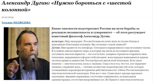 В одном из последних интервью, опубликованных, как ни странно, в газете с обязывающим названием «Культура», Александр Гельевич Дугин призывает всю нашу страну огромную на смертный бой «с пятой и шестой колоннами». Относит к «шестой колонне» всех, кому, как можно понять из текста, дороги свобода слова, и свобода рынка, и право на разномыслие. Приписывает шестоколонному окружению Президента коварные умыслы «эпистемологически оккупировать» страну.