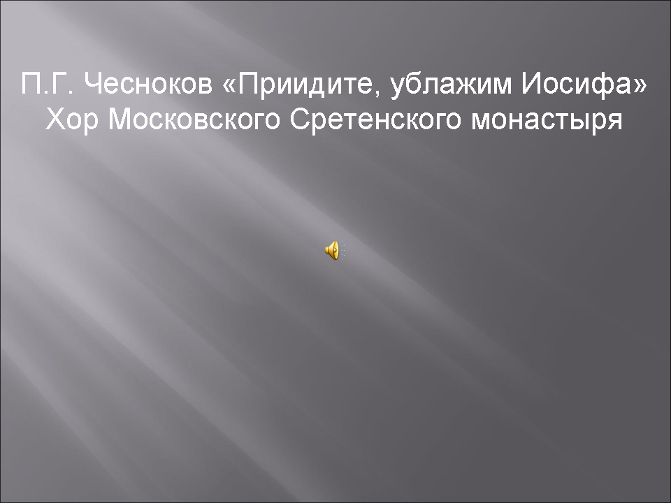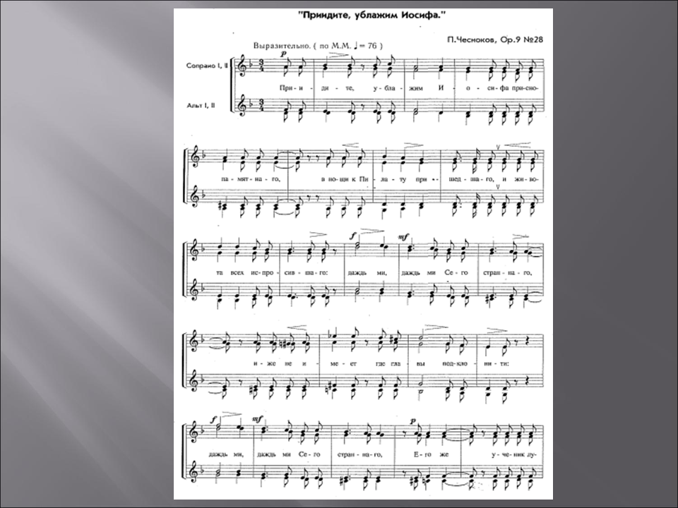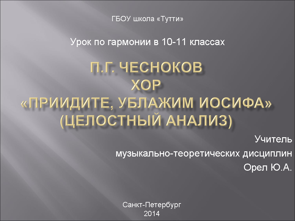 Ю.А. Орел Урок гармонии в 10, 11 классахТема урока: П.Г.Чесноков. Хор «Приидите, ублажим Иосифа». (Целостный анализ). Ученики 10-11 классов разучивают и исполняют хор П.Г.Чеснокова «Приидите, ублажим Иосифа» в рамках учебного предмета хоровой класс. Цели данного урока по гармонии – продемонстрировать возможности и разнообразные методы комплексного анализа, дать такой пример разбора текста и музыки хора П.Г.Чеснокова «Приидите, ублажим», который поможет ребятам глубже вникнуть в суть этого произведения, понять и почувствовать его музыкально-поэтический образ.Думается, что предпринятый нами целостный анализ хора П.Г.Чеснокова будет способствовать более осмысленному, заинтересованному и творческому отношению к работе над этим сочинением в рамках хорового класса, а также поможет улучшить качество его исполнения. Данный урок выявляет межпредметные связи таких дисциплин как гармония, литература, история, хоровой класс, анализ музыкальных произведений.