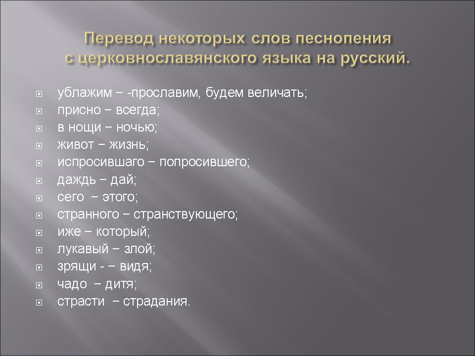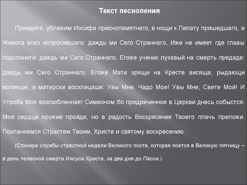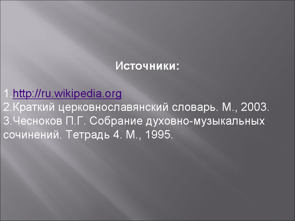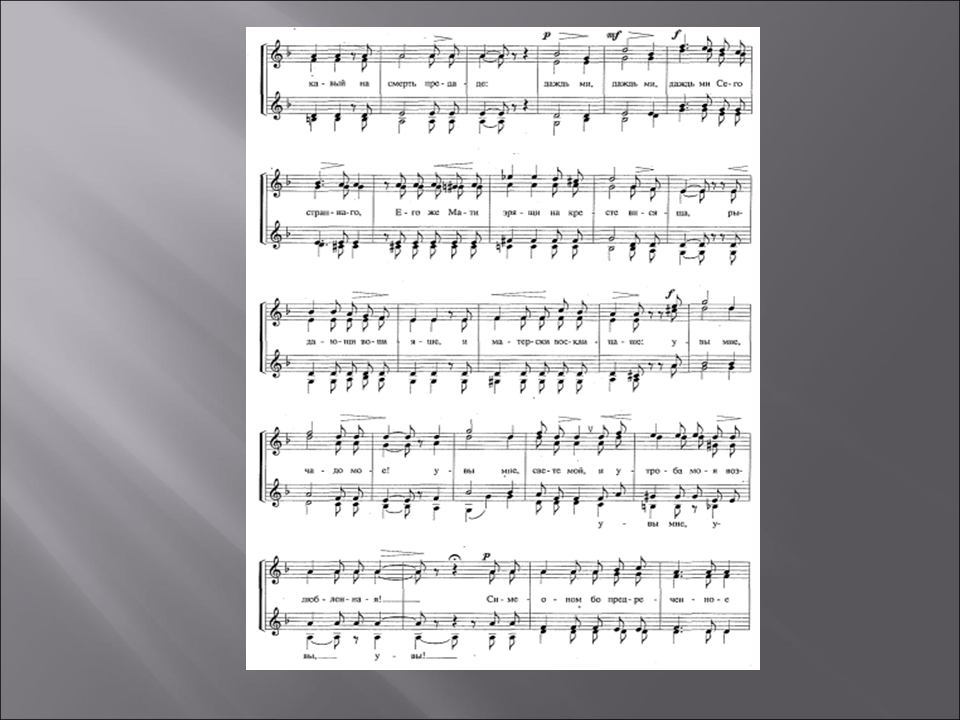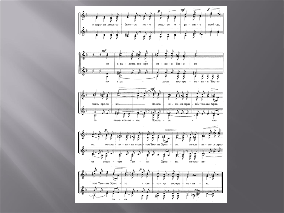 Ход урока. 1.Приветствие, объявление темы урока (слайд 1). 2.Краткая беседа о творчестве П.Г.Чеснокова (слайд 2). 3.Чтение и анализ текста: место и значение текста в православном богослужении,перевод с церковнославянского языка, краткая характеристика библейских персонажей, упоминаемых в тексте, показ изображений данных персонажей на православных иконах и картинах известных мастеров(слайды 3-9). 4.Обсуждение выбора композитором исполнительского состава для данного произведения (женский хор, существуют переложения для мужского и для смешанного; вероятно, это связано с различными вариантами составов хора в православной церкви:мужской хор в мужском монастыре, женский – в женском, смешанный – в приходской церкви). 5.Анализ музыки хора П.Г.Чеснокова «Приидите, ублажим» в связи со структурой и образным строем текста. Учитель играет раздел, затем он предлагает ученикам высказать свои образные ассоциации, после чего помогает ребятам выявить в музыкальном тексте те средства, которыми композитор создает этот образ. Особое внимание при анализе музыки хора обращается на тональный план и выбор гармонических средств. Наиболее характерные гармонии подписываются учениками в музыкальном тексте хоровой партитуры, по которой они исполняют это произведение на уроках хорового класса (слайды 10-12). 6.Выводы об особенностях воплощения текста в музыке при помощи следующих выразительных средств: · музыкальная форма – прозаический текст нашел выражение в сквозной музыкальной форме, имеющей черты трехчастной репризной с кодой; · тональность – основная тональность d-moll выражает общий скорбный характер текста, появление мажорных тональностей D-durи B-dur связано с упоминанием в тексте о грядущем воскресении; · фактура – аккордовая, отражающая собранный и сдержанный тон молитвенного высказывания (отметим, что данный тип фактуры, в целом, характерен для церковного многоголосия); · гармония – плагальные обороты как типичная черта русской музыки, а также, в данном произведении, как выражение обреченности, неизбежности, предопределенности; аккорды уменьшенной и полууменьшенной структуры, разнообразные эллиптические сочетания как средства, передающие страдание и душевную боль; органный пункт как прием, рисующийнастроения скованности, сдержанности, предрешенности и смирения; · жанр – характерные признаки сарабанды – испанского траурного танца, который отличают мерная трехдольность, сдержанный темп, минорная тональность. 7.Слушание хора П. Г. Чеснокова «Приидите, ублажим Иосифа» в исполнении хора Московского Сретенского монастыря (слайд 13). 8.Итоги урока. a) художественные: Что может музыка в процессе воплощения поэтического текста? b) методические: Понравился ли такой подход к сочинению П.Г.Чеснокова? c) перспективные: Был ли интересен и полезен такой анализ? Какие произведения вы хотели бы проанализировать таким образом? Хор Московского Сретенского монастыря - Приидите, ублажим Иосифа. Послушать запись.