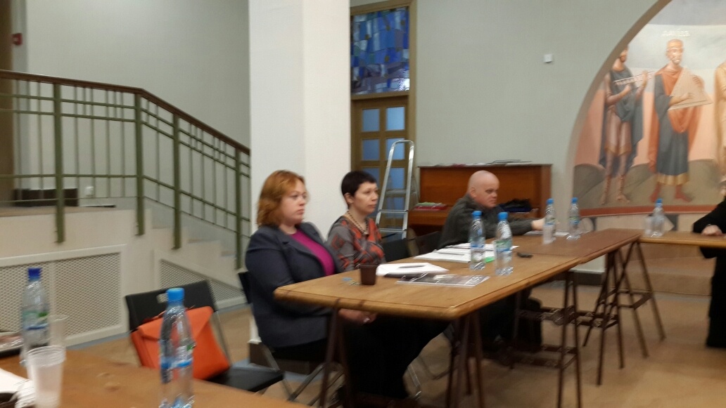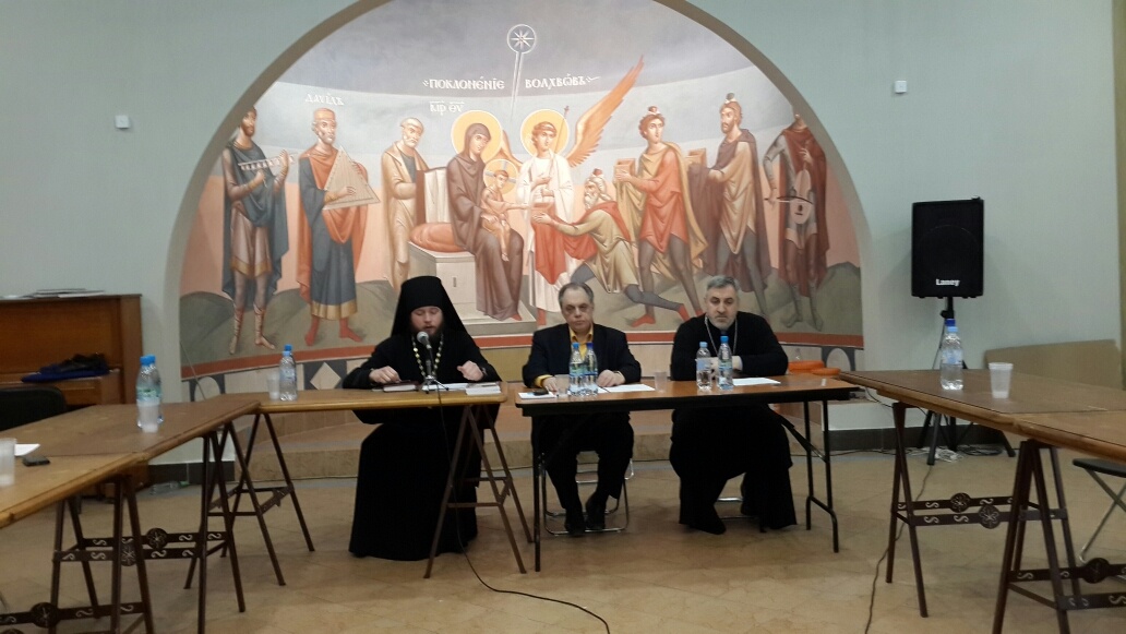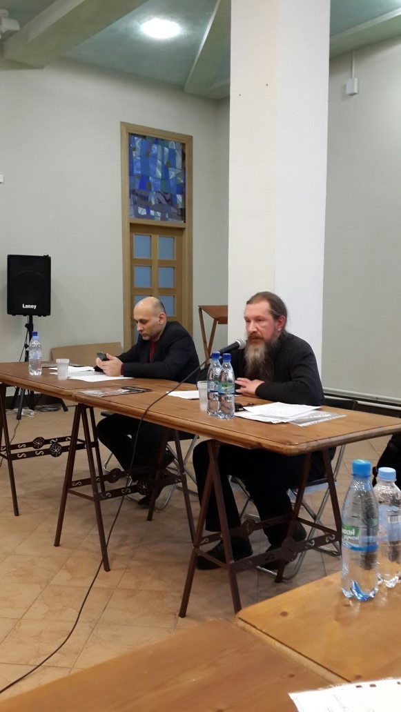 В своем докладе иеромонах Леонид (Маньков) подробно рассказал о деятельности своего отдела, включающего как пасторское попечение военнослужащих и сотрудников силовых структур, так и патриотическое воспитание молодежи. Большая работа проводится по восстановлению института военных священников. Последнему аспекту был посвящен и доклад о. Леонида (Маркова) на примере «дореволюционного» устройства этого института и деятельности протопресвитера военного и морского духовенства Александра Желобовского. ДокладМ.А. Кустова был посвящен ретроспективному обзору отношения исторической Церкви к военным конфликтам. На основании анализа текстов Свящ. Писания, Предания и церковных авторитетов было продемонстрировано позитивное отношение Православной Церкви к службе в армии, изучению воинского искусства, принятию присяги и выполнению воинского долга (включая убийство военнослужащих противника). Председатель Экспертного совета Международного общественного движения «Гражданский Мир» А.В. Посадский в своем выступлении предложил создать направление «Онтология войны». Выступление заместителя председателя Экспертного совета Международного общественного движения «Гражданский Мир», доцента СПбГУ, кандидата исторических наук, доцент СПбГУ, члена Союза журналистов Санкт-Петербурга и Ленинградской области и Санкт-Петербургского философского общества Д.А. Рущина было посвящено недостаточному присутствию РПЦ в светских СМИ. Он также отметил, что информационная война против России и РПЦ началась еще до событий на Украине. Украина расколота цивилизационно. В ней нет реального географического, этнического, политического и религиозного единства. Хотя в целом она относится к византийскому православию, на ее территории действуют Украинская православная церковь Московского патриархата, доминирующая на востоке, раскольническая Украинская православная церковь Киевского патриархата в центре страны и униатская Украинская греко-католическая церковь на западе. Кроме того, есть еще неканоническая константинопольская Украинская автокефальная православная церковь. Между ними наблюдается острое соперничество во всех регионах. Затем состоялась свободная дискуссия. Зам. Председателя Общества Граждан сирийского происхождения Ваддах Ал-Джунди говорил о необходимости межрелигиозного диалога. Священник Владимир (Коваль-Зайцев) выступил с критикой ранее прозвучавшей позиции о Церкви, как авангарде боевых действий, призвав к более внимательному осмыслению ее роли. По словам апостола Павла «Наша брань не против крови и плоти, а против духов злобы поднебесной». Старший научный сотрудник факультета политологии СПбГУ М.А. Коновалова отметила сложившуюся в общественном сознании дихотомию Церкви в виде духовной и социальной составляющей, что приводит к возможности манипулирования церковью со стороны политиков. О Церкви как социальном институте говорил и общественный деятель А.В. Болтянский. В заключение И.Е. Шувалов отметил, что важно искать консенсус приоритетов в своей мировоззренческой позиции. На сегодняшний день мы видим неустойчивость вплоть до противоположности. Использует ли государство Церковь в своих целях или служит опорой для реализации духовной миссии? Такие вопросы можно поставить в каждом сегменте нашей жизни. Участ