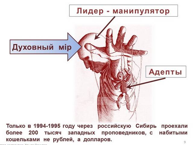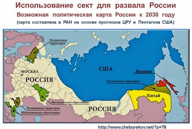 Российская «оранжевая» оппозиция собирается запустить американский сценарий «Майдана» и в России. Это факт. Важнейшей целью нео-культов определено их внедрение в государственные структуры для реализации программы «Новый мировой порядок». Об этом совершенно открыто сообщал в одноименной книге, причисленной в России к разряду экстремистской литературы, рижский пастор-неопятидесятник организации «Новое Поколение» Алексей Ледяев. Его единоверцы сегодня активно участвуют в закреплении позиций «оранжевой революции» на Украине и пока менее активно протестуют против «тоталитарного политического режима» в России. Но это пока. Настанет время и они, набрав силу и политическое влияние, встанут в полный рост. Правительство Соединенных Штатов Америки в своем отношении к духовности России копируют стратегию Адольфа Гитлера. Во время Второй Мировой войны в религиозной политике по отношению к оккупируемым территориям Советского Союза германские власти стремились исполнять указание Гитлера: «Мы должны избегать, чтобы одна Церковь удовлетворяла религиозные нужды больших районов, и каждая деревня должна быть превращена в независимую секту. Если... захотят практиковать черную магию, как это делают негры или индейцы, мы не должны ничего делать, чтобы воспрепятствовать им. Коротко говоря, наша политика на широких просторах должна заключаться в поощрении любой и каждой формы разъединения и раскола» (См. Регельсон Л. Трагедия Русской Церкви, 1917-1945. Париж, 1977. С. 510) И в наши дни в случае дальнейшей беспрепятственной реализации заданной геополитической стратагемы при помощи деструктивных религиозных культов (сект) нашу страну ожидает чрезвычайно печальная перспектива.