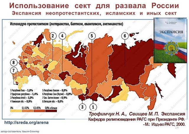 Показательно, что наивысшая активность различных неорелигиозных объединений заметна именно на тех территориях России, которые предполагается «подарить» другим странам... Это очевидно из анализа карт, обозначающих зоны проявления деятельности подобных культов. Один из примеров помещен ниже.