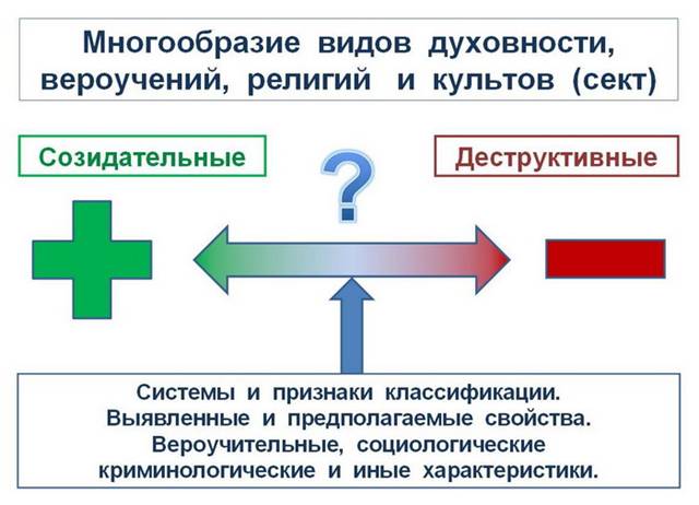 Каждое из них имеет свои особенности, вероучительные, социологические, криминологические и иные характеристики. Подробнее см. следующие издания: Хвыля-Олинтер А.И., свящ., к.ю.н. Духовная безопасность и духовное здоровье человека, семьи, общества. - М., «Даръ», 2008; Хвыля-Олинтер А.И., свящ., к.ю.н. Духовно-религиозные основания национальной безопасности России. - М., Академия управления МВД РФ, 2012; Хвыля-Олинтер А.И. и др. Государственная политика защиты нравственности и СМИ. Рабочая книга для законодателя. - М.: Наука и политика, 2014.