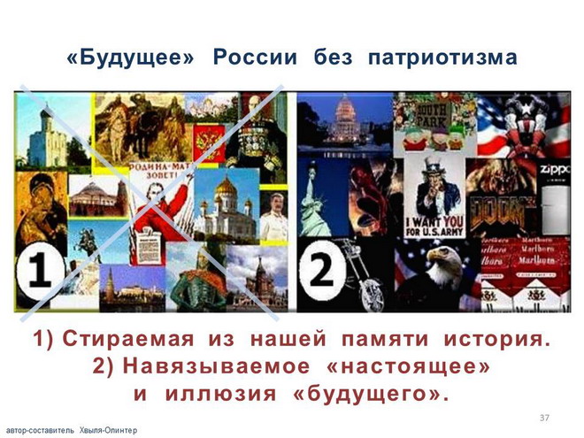 Каждому из нас, как и правительству России, нужно совершенно отчетливо понимать - основная причина наших социальных, семейных и личных неурядиц - кризис духовностинаселения, экзистенциальный, смысловой кризис, и одновременно с ним пришедшая духовная агрессия извне. «Будущую» Россию без сформированного у граждан патриотизма можно представить следующим образом: - Последовательно и тщательно стираемая из нашей памяти история своего народа, этноса. - Навязываемое, занимающее место стертой из памяти истории, «настоящеее» и иллюзия прекрасного и светлого «будущего», имеющая слабое отношение к ожидаемой в недалекой перспективе реальности.