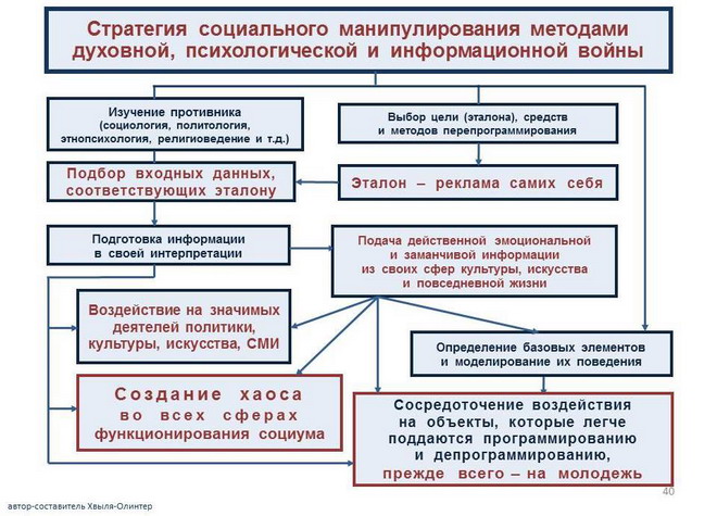 Можно выделить два основных признака информационного, психологического и духовного порабощения народа, нации: 1) Навязывание порабощаемому народу чужой культуры: языка, искусства, мыслей, чуждых традиций и обычаев, чужих героев, чуждых праздников, духовности, чуждых вероучений, религиозных практик, идеологии сект, нежизнеспособных фрагментов в прошлом цельных традиционных религий, иного образа жизни. 2) Дискредитация, уничижение, высмеивание, искажение, забвение нашей родной культуры: языка, искусства, истории, спорта, игр, обычаев, традиций, наших героев, праздников, духовности, нашего образа жизни. Существует, работает и постоянно совершенствуется определенная спланированная стратегия социального манипулирования методами духовной, психологической и информационной войны, направленной на ослабление государств - конкурентоспособных оппонентов идеологии так называемого англо-саксонского мироустройства.