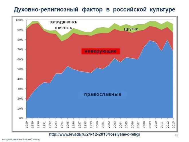Российский патриотизм имеет свои ключевые ценности, святыни: Родину, Отчизну, Державу, веру, святых людей, святые события, святые места, святые даты, передаваемые из поколения в поколение сакральные символы... Хранители этих святынь - наши созидательные традиционные религии, прежде всего, поскольку титульной, государствообразующей нацией России является русский народ - Православие. Социологические опросы подтверждают, что все больше россиян соотносит себя с христианской православной религиозной традицией.