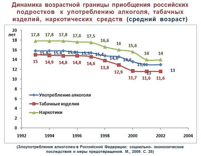 Второй пример. Давайте посмотрим на динамику смещения возрастной границы приобщения российских подростков к употреблению алкоголя, табачных изделий и наркотических средств за период с 1992 по 2004 годы (см. сборник трудов Злоупотребление алкоголем в Российской Федерации: социально- экономические последствия и меры предотвращения. М., 2009. С. 25). Значительное снижение в среднем на 3,5 года по всем показателям.