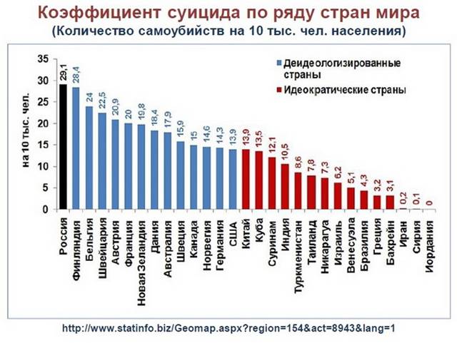 Третий пример. Россия стабильно занимает первое место в мире по количеству самоубийств среди детей и подростков. Как сообщает в пресс-релизе о взаимодействии с интернет-сообществом по профилактике суицида 11 марта 2013 года Роспотребнадзор (Федеральная служба по надзору в сфере защиты прав потребителей и благополучия человека), за последние годы количество детско-юношеских суицидов и попыток самоубийств увеличилось на 35-37%. В стране происходит порядка 19-20 случаев самоубийств на 100 000 подростков. Это число в 3 раза выше общемировых показателей. Наибольшая частота суицидов наблюдается у подростков и молодых людей в возрасте 15-35 лет. На одну смерть в этой категории приходится до 200 нереализованных суицидальных попыток.