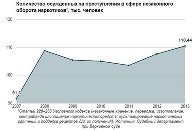 Четвертый пример. Динамика количества осужденных за преступления в сфере незаконного оборота наркотиков в России за период с 2007 по 2013 годы. Наблюдается значительный рост этого показателя.
