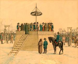 Картина «Утро стрелецкой казни». Василий Суриков Лишь с воцарением на трон в 1649 году Алексея Михайловича — сына первого царя из династии Романовых — был принят первый в истории России систематизированный свод законов, так называемое Соборное Уложение. Впрочем, даже в этом документе смертная казнь оставалась основным видом уголовного наказания. Законодательные акты Петровской эпохи, как правило, ужесточали и расширяли ранее узаконенные уголовные репрессии. По подсчетам историков, за время царствования Петра I было издано 392 законодательных акта уголовно-правового характера. Самый значительный из них — «Артикул воинской с кратким толкованием» 1715 года. Именно в нем содержится наибольшее в истории отечественного права количество санкций с указанием на смертную казнь. Чтобы быть более конкретными, отметим, что в эпоху Петра Великого в Российской Империи казнили за 122 вида преступлений. Только за один Стрелецкий бунт были повешены или обезглавлены сразу 2000 человек, причем пятерым из них Петр Алексеевич отрубил голову лично. Впрочем, способов отъема жизни петровские палачи знали великое множество, так что средневековые инквизиторы позавидовали бы их изощренности и жестокости: преступников топили, сжигали, мучили до смерти, четвертовали, ну и, конечно, любимое – посажение на кол.