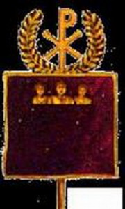 После одержанной блистательной победы Император приказал сделать так называемый Лабарум – императорскую хоругвь или штандарт. Лабарум представлял собой продолговатый крест, с поперечной реи которого спускался вышитый золотом и украшенный драгоценными камнями кусок шелковой ткани с изображениями Константина и его сыновей; на вершине креста был прикреплен золотой венок, внутри которого была монограмма Христа.