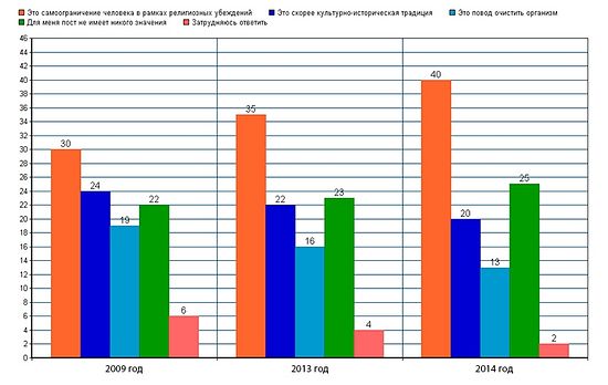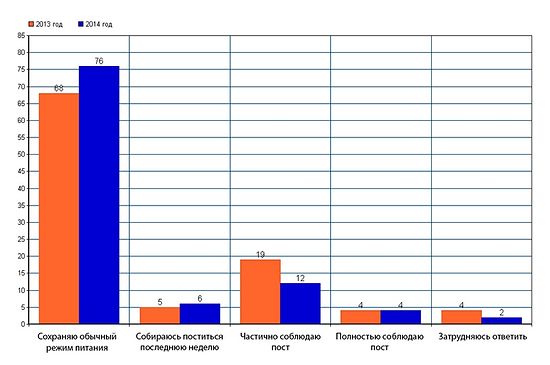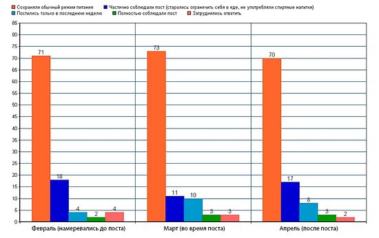 Похожие факты есть и в опросах «Левада-Центра» за 2014 год: процент строго постящихся не меняется в начале, середине и конце поста. У «Левада-Центра» в данных есть весьма интересный момент. До начала частично поститься хотели 18%, в середине частично соблюдали пост 11%, а после завершения поста о частичном соблюдении его заявили опять-таки 17%. То есть они присоединились к постящимся по ходу дела. Похожая ситуация у тех, кто постится последнюю неделю: планировали так поступить 4%, к середине поста число желающих выросло до 10%, а после окончания поста оказалось, что постились последнюю неделю 8%. Опрос «Левада-Центр» о Великом посте 2014 года