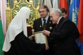 Святейшему Патриарху Кириллу вручена награда Академии российской словесности28 марта 2010 года, в день праздника Входа в Господня в Иерусалим, в Тронном зале Патриарших палат Храма Христа Спасителя состоялась встреча Святейшего Патриарха Московского и всея Руси Кирилла с членами президиума Академии российской словесности (АРС). В начале встречи президент Академии, секретарь правления Союза писателей России Ю.А. Беляев представил Его Святейшеству членов президиума АРС.Во встрече приняли участие: советник председателя Совета Федерации РФ, заслуженный деятель науки РФ, вице-президент АРС профессор О.И. Карпухин; вице-президент Гильдии российских адвокатов, заслуженный юрист России, член Союза писателей России В.М. Наринян; член Союза писателей России Д.А. Жуков; генеральный директор издательства «Парад», член Союза писателей России А.Я. Дегтярев; секретарь Московской областной писательской организации, главный ученый секретарь АРС Г.Б. Осипов; член Высшего творческого совета Союза писателей России, главный редактор газеты «Слово» В.А. Линник. На встрече также присутствовал протоиерей Всеволод Чаплин, председатель Синодального отдела по взаимоотношениям Церкви и общества. Ю.А. Беляев от лица руководства Академии обратился к Предстоятелю Русской Церкви с приветствием и сообщил о решении президиума АРС наградить Святейшего Патриарха Кирилла общественной наградой «Золотая Вифлеемская звезда». Награда вручена в знак признания личных заслуг Его Святейшества в деле патриотического и духовно-нравственного преображения России, единения православных народов, укрепления основ христианства в современном обществе. Вручая награду, Ю.А. Беляев отметил, что Святейший Патриарх Кирилл стал третьим лауреатом Золотой Вифлеемской звезды, которой ранее были награждены Святейший Патриарх Московский и всея Руси Алексий II и Святейший Патриарх Сербский Павел. Предстоятель Русской Церкви обратился к собравшимся с ответным словом, в котором поблагодарил руководство Академии российской словесности за высокую награду. «В свое время я совершенно сознательно принял предложение войти в состав Академии, потому что всегда осознавал, а ныне особым образом, с большей силой осознаю важность того, что есть русский язык и русская литература, — отметил Святейший Патриарх Кирилл. — Через русский язык передается наш культурный духовный код, а русская литература формирует и закрепляет этот код на интеллектуальном уровне». «С разрушением художественной литературы из жизни уходят положительные герои, тот самый образ положительного героя, который сформирован христианскими истоками нашей национальной культуры, — продолжил Святейший Владыка. — Вот почему так важно сегодня бороться за сохранение русского языка, ибо использование современных средств коммуникаций очень сильно трансформирует язык». По словам Его Святейшества, усвоение этого трансформированного языка всем обществом нанесет колоссальный ущерб русскому языку, поэтому тема словесности сегодня имеет совершенно особое значение. Святейший Патриарх Кирилл с сожалением отметил, что, согласно существующей статистике, большинство граждан России «формирует свои очень небольшие домашние библиотеки, ориентируясь на те книги, которые, к сожалению, никак не могут ассоциироваться с классич