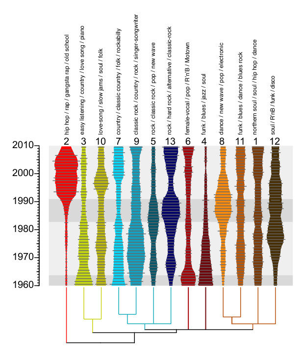 Развитие популярности 13 разных жанровM. Mauch et al./ Royal Society Open Science