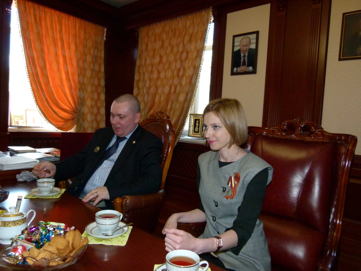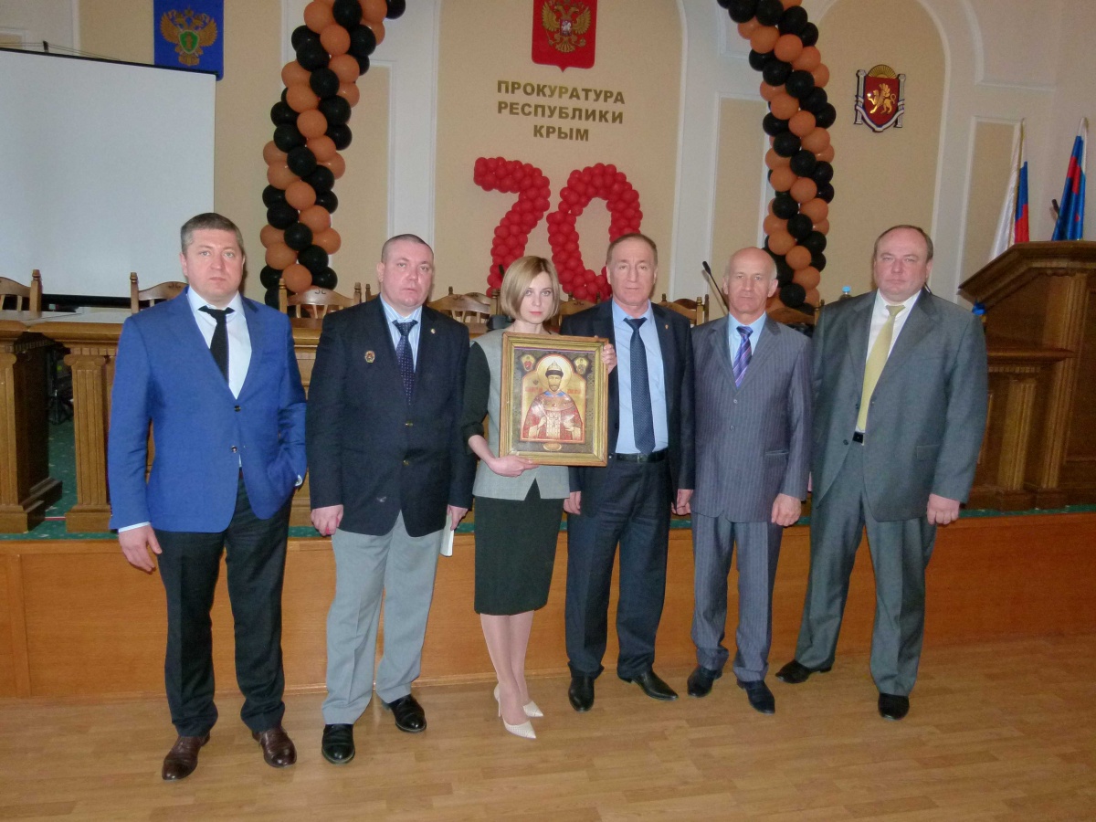 Чудотворная мироточивая икона Царя Николая побывала в Крыму11 мая 2015 года по приглашению Прокурора Крыма Натальи Поклонской и ряда общественных крымских организаций, делегация Войсковой Православной Миссии прибыла из Москвы в Симферополь. Вместе с собою московские гости доставили великую святыню Русского православного мира – Чудотворную мироточивую икону Царя Николая Второго. Первообраз сей иконы был написан в США известным русским иконописцем Павлом Тихомировым по заказу основательницы Общества почитателей дворянства Ии Дмитриевны Шмит. В 1997 году цветные литографии иконы были привезены в Россию игуменом Германом (Подмошенским) – сомолитвенником знаменитого американского иеромонаха Серафима Роуза. В Свято-Никольской богадельне Рязани с литографии были сделаны цветные ксерокопии, одна из которых была привезена в Москву. 6 сентября 1998 года эта икона заблагоухала в Сретенском монастыре за водосвятным молебном после пропетого тропаря Св. Царю Николаю, 7 ноября 1998 года икона замироточила. С этого момента чудотворная икона начала свое путешествие по храмам и монастырям Великой, Малой и Белой Руси. Образ Святого Царя Николая II побывал в Белоруссии и в Абхазии, дважды на Святой Горе Афон, Греции, Австрии, Германии, Франции, Голландии, Финляндии, Украине, Сербии, Черногории, Бельгии. В июне 1999 года образ Царя Николая II по благословению Патриарха Алексия II облетел границы бывшей Российской Империи. Самолет прошел над Минском, Киевом, Крымом, Чечней, Новосибирском и Камчаткой. На сегодняшний день икона Государя, почитаемая верующими всего православного мира, посетила более 40 епархий Русской Православной Церкви. Сотни исцелений зафиксированы у мироточивого образа нашего Государя. Тысячи верующих по молитвам Св. Царя-Мученика получили помощь и поддержку. Вечером этого дня московские паломники поклонились мощам великого угодника Божия – Святителя Луки Крымского (Войно-Ясенецкого). 12 мая 2015 года делегация Войсковой Православной Миссии (ВПМ) в составе начальника ВПМ Игоря Смыкова, членов Попечительского Совета Абаева Х.С., Мезенцева В.А., Инаркаева С.Д., Соловьева И.Н. была принята Прокурором Крыма Натальей Владимировной Поклонской. Игорь Смыков подробно рассказал Наталье Поклонской об истории Иконы, а также передал книги с авторскими подписями Александра Агеева, Бориса Галенина, Аллы Дьяковой, Петра Мультатули, посвященных Царской теме. Также Игорь Евгеньевич Смыков вручил Прокурору Крыма Наталье Владимировне Поклонской Юбилейную медаль «В память Великой войны», посвященную событиям Первой мировой. Высокой православной награды Наталья Поклонская удостоена: «За многолетние миссионерские и просветительские труды, любовь к Богу, верность Царю и Отечеству». На лицевой стороне медали помещено изображение Государя Императора Николая Второго, медаль освящена и приложена к Чудотворному образу Святого Царя. В дар госпоже Поклонской, горячо почитающей святую память Святых Царственных Мучеников, была передана и копия Чудотворной мироточивой иконы Царя Николая Второго, выполненная известным московским художником и иконописцем Геннадием Малофеевым. Наталья Владимировна Поклонская тепло поблагодарила членов делегации Войсковой Православной Миссии за визит Иконы Государя и награждение царской медалью, сказав, что много л