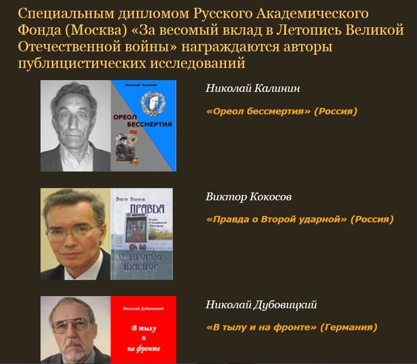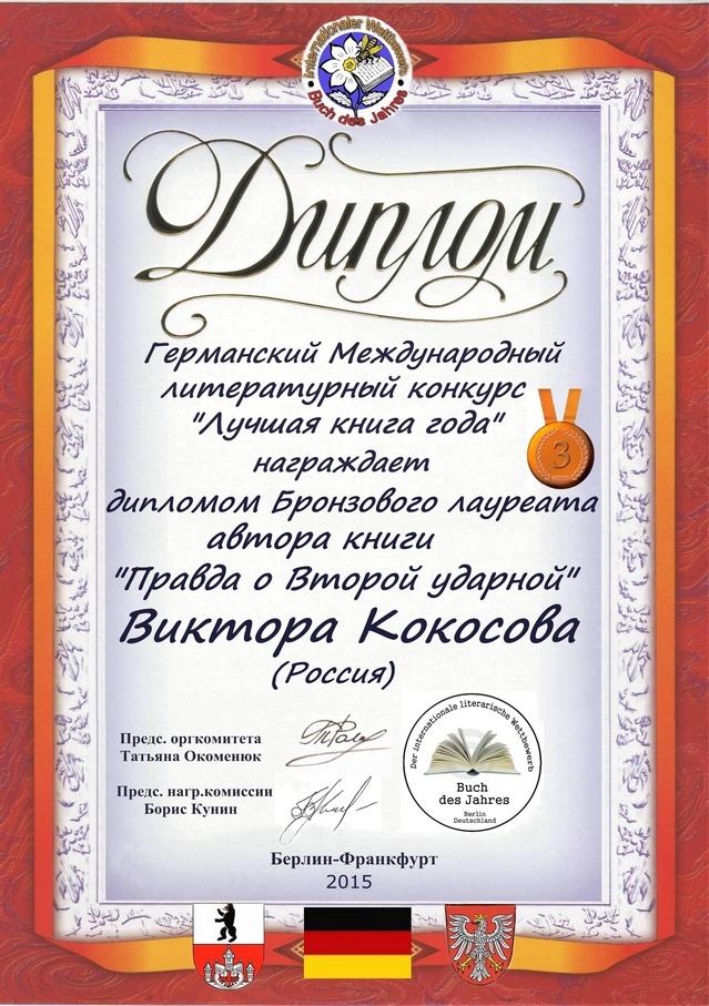 По итогам Германского международного литературного конкурса «Лучшая книга года» в числе победителей оказался петербургский писатель и публицист Виктор КокосовПо итогам только что завершившегося Германского международного литературного конкурса «Лучшая книга года» (Берлин – Франкфурт) в числе победителей оказался петербургский писатель и публицист Виктор Николаевич Кокосов с книгой «Правда о Второй ударной». Он стал бронзовым лауреатом, а также получил специальный диплом Русского Академического Фонда (Москва) – «За весомый вклад в Летопись Великой Отечественной войны». Интересно отметить, что недавно Виктор Кокосов уже стал лауреатом литературной премии «Наследники Победы», учреждённой к 70-летию Великой Победы – за очерки и рассказы, опубликованные в 2013-2014 годах. И вот теперь состоялось международное признание труда писателя. Виктор Кокосов является активистом Международного общественного движения "Гражданский Мир".