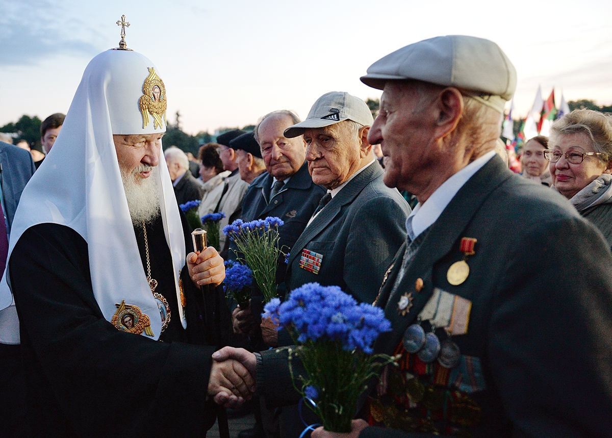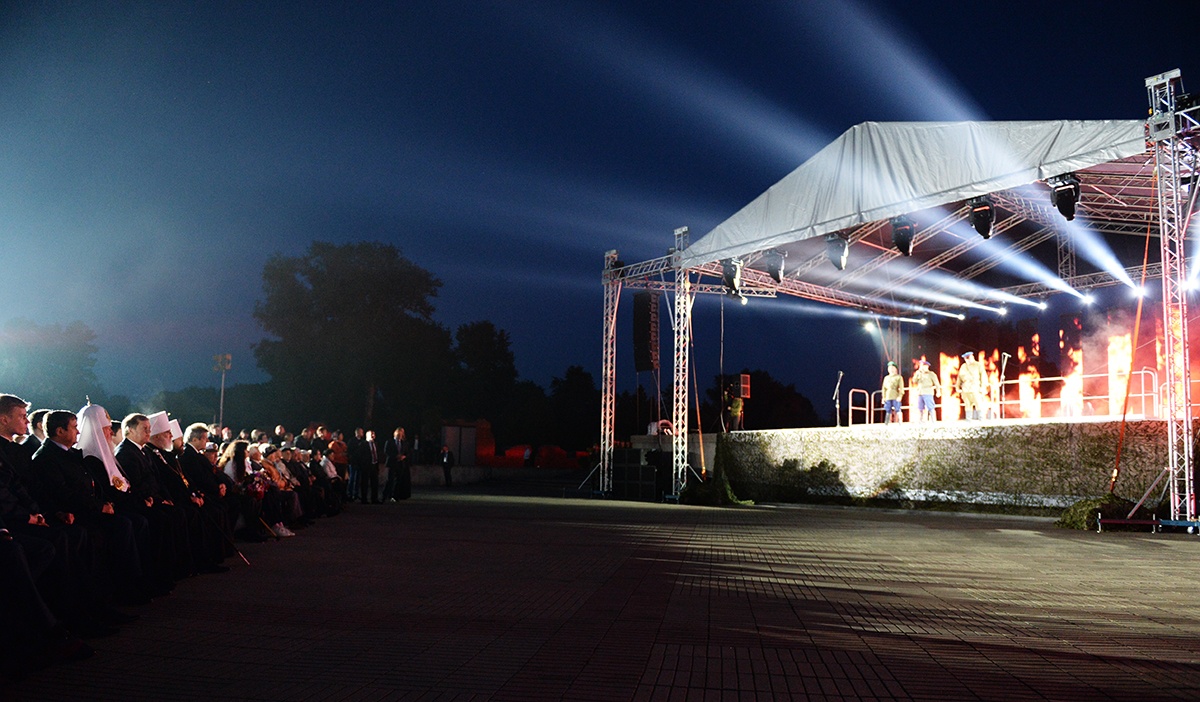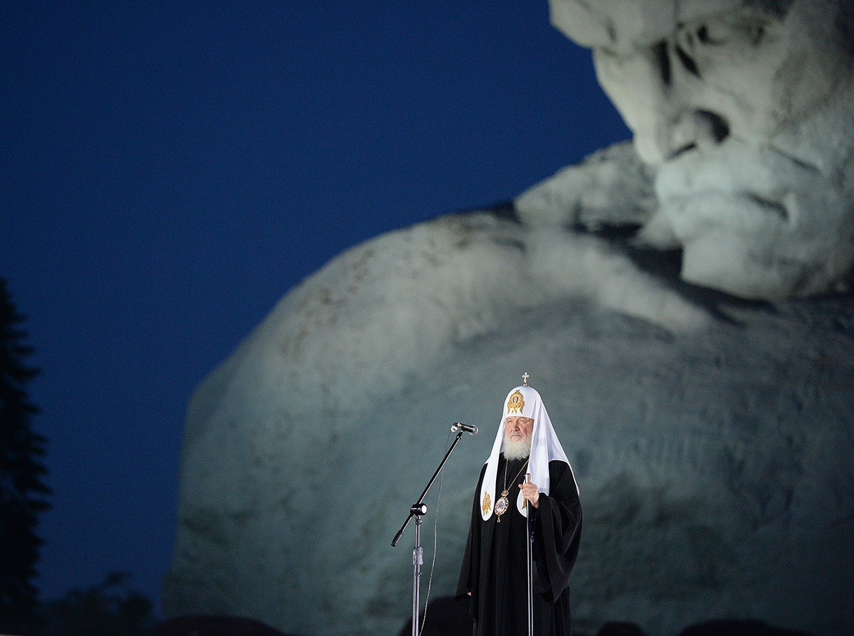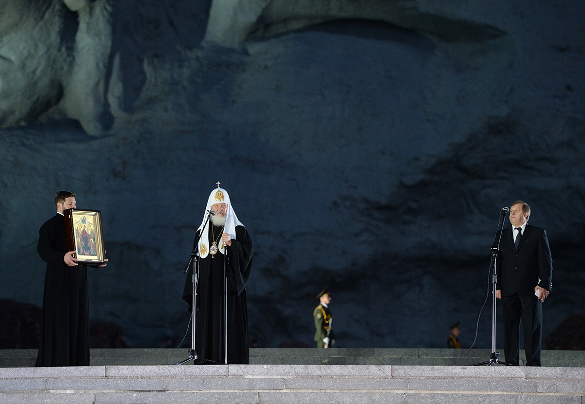 После музыкально-театрализованного представления, посвященного подвигу защитников крепости, Святейший Патриарх Кирилл и председатель Брестского облисполкома А.В. Лис приняли участие в церемонии возложения венков к мемориалу героев Брестской крепости, а затем обратились со словами к участникам митинга.