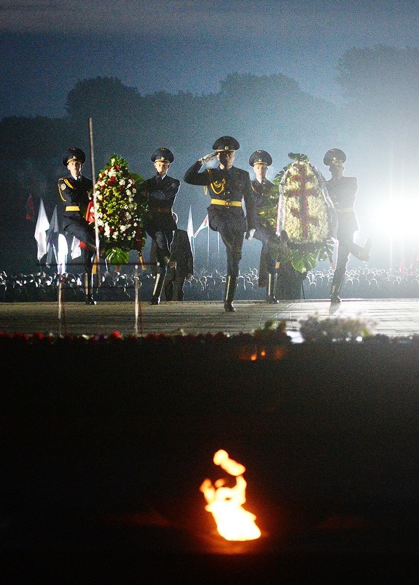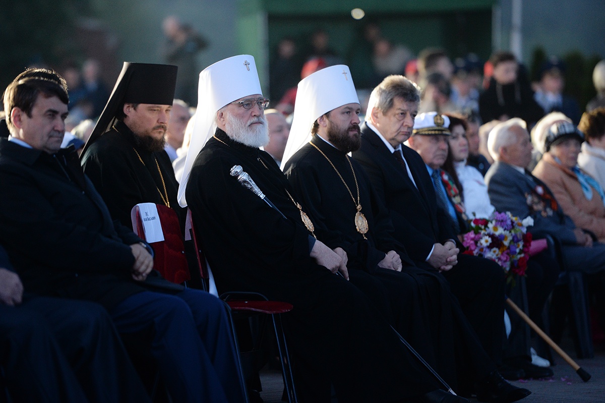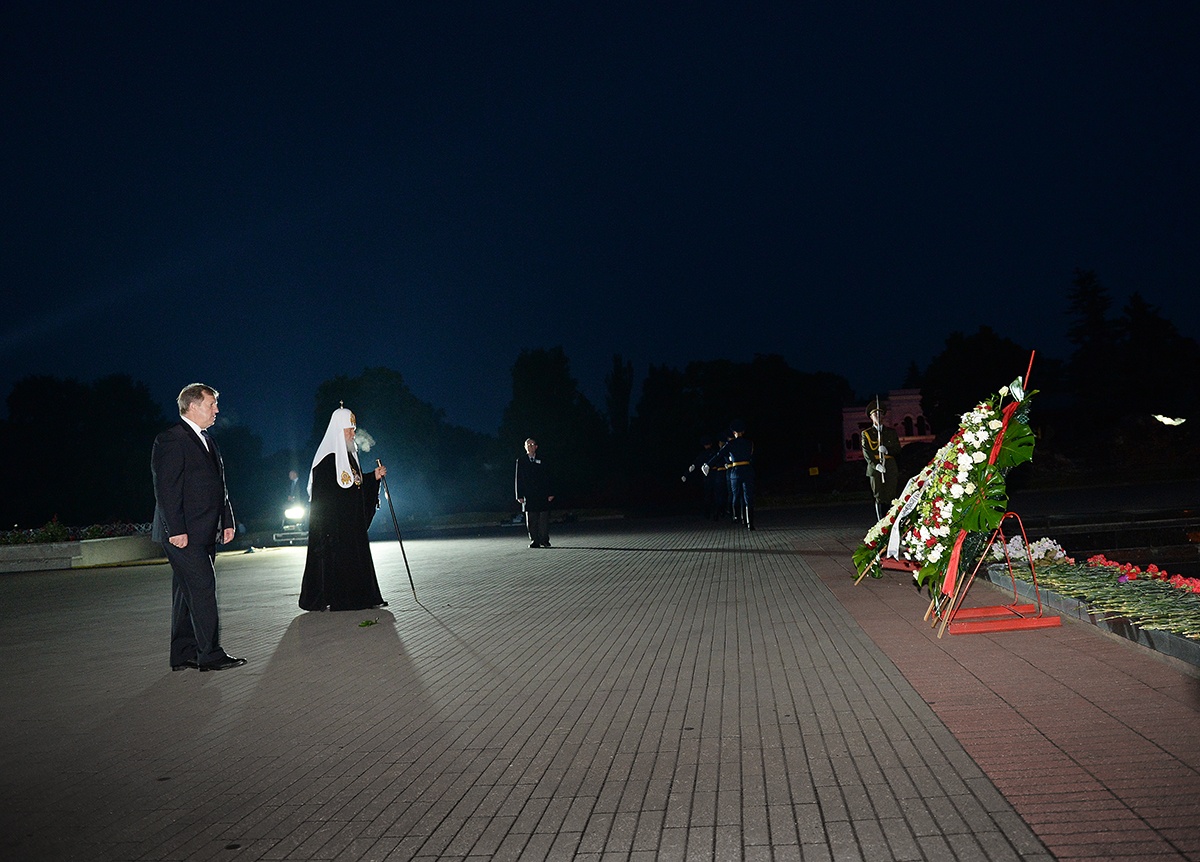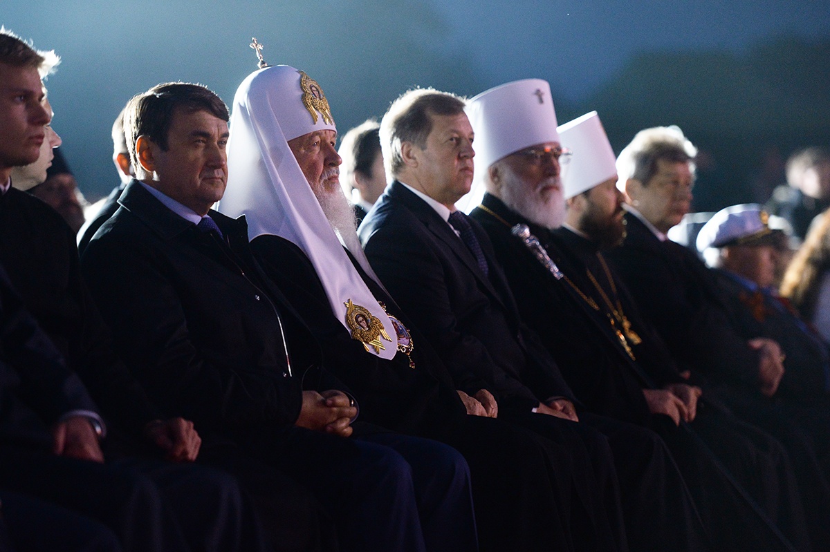 После музыкально-театрализованного представления, посвященного подвигу защитников крепости, Святейший Патриарх Кирилл и председатель Брестского облисполкома А.В. Лис приняли участие в церемонии возложения венков к мемориалу героев Брестской крепости, а затем обратились со словами к участникам митинга.