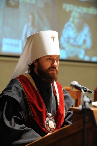 Митрополиту Илариону присуждена степень почетного доктора Российского государственного социального университета14 апреля 2010 года ректор Общецерковной аспирантуры имени святых равноапостольных Кирилла и Мефодия, председатель Отдела внешних церковных связей Московского Патриархата митрополит Волоколамский Иларион посетил Российский государственный социальный университет (РГСУ). Владыку встречал ректор вуза, академик РАН В.И.Жуков, который ознакомил гостя с работой университета. Затем председатель ОВЦС осмотрел Электронную социальную библиотеку, побывал в аудиториях и музее вуза. Ректор университета рассказал о проекте мемориала, посвященного Победе в Великой Отечественной войне 1941-1945 годов, который планируется открыть к 9 мая. РГСУ был основан в 1991 году. В настоящее время он имеет 42 филиала в разных городах России. В нем обучается 128 тысяч студентов по 151 специальности. По численности учащихся вуз является самым большим в России. Среди его выпускников 12 олимпийских чемпионов, 14 гроссмейстеров, 72 чемпиона мира. При университете действует учебно-реабилитационный комплекс, реализуются физкультурно-оздоровительные программы для инвалидов. В этом году РГСУ выиграл Всероссийский конкурс «Вуз здорового образа жизни»: на всей территории вуза запрещено курение. В зданиях университета в советское время находился Коминтерн, а затем школа разведчиков. Этому периоду также посвящена одна из выставок университета. В актовом зале митрополита Волоколамского Илариона приветствовали Пасхальным тропарем, который исполнил академический и смешанный хор РГСУ. На расширенном заседании Ученого совета, председателем которого является В.И.Жуков, было принято решение о присуждении митрополиту Илариону степени почетного доктора Российского государственного социального университета. Владыке вручили диплом и мантию. В режиме реального времени работа заседания транслировалась в филиалах вуза по всей стране. Председатель ОВЦС поблагодарил ректора и членов Ученого совета за высокую награду и обратился с архипастырским словом к собравшимся в зале преподавателям и студентам. По окончании выступления митрополит Иларион ответил на многочисленные вопросы, в частности, об актуальности теологического образования и о возможности поступления выпускников РГСУ в Общецерковную аспирантуру и докторантуру. На память владыка Иларион подарил В.И.Жукову Казанский образ Божией Матери. Со своей стороны ректор РГСУ отметил большую значимость такого документа Русской Православной Церкви, как Основы социальной концепции. Он напомнил, что христианская вера наполнена примерами пасторских посланий и предложил в ходе проведения X Всероссийского научно-педагогического социального конгресса одну из секций посвятить изучению и подведению итогов реализации Основ социальной концепции Русской Православной Церкви. По завершении работы заседания Эстрадно-симфоническим оркестром и хором РГСУ была представлена музыкальная программа, в которой прозвучали произведения русских классиков, а также митрополита Илариона – фрагменты из оратории «Страсти по Матфею» и «Всенощного бдения» под управлением заслуженного работника культуры, доктора философских наук профессора К.Н.Кострикова. Докторами РГСУ honoris causa также являются Святейший Патриарх Московск