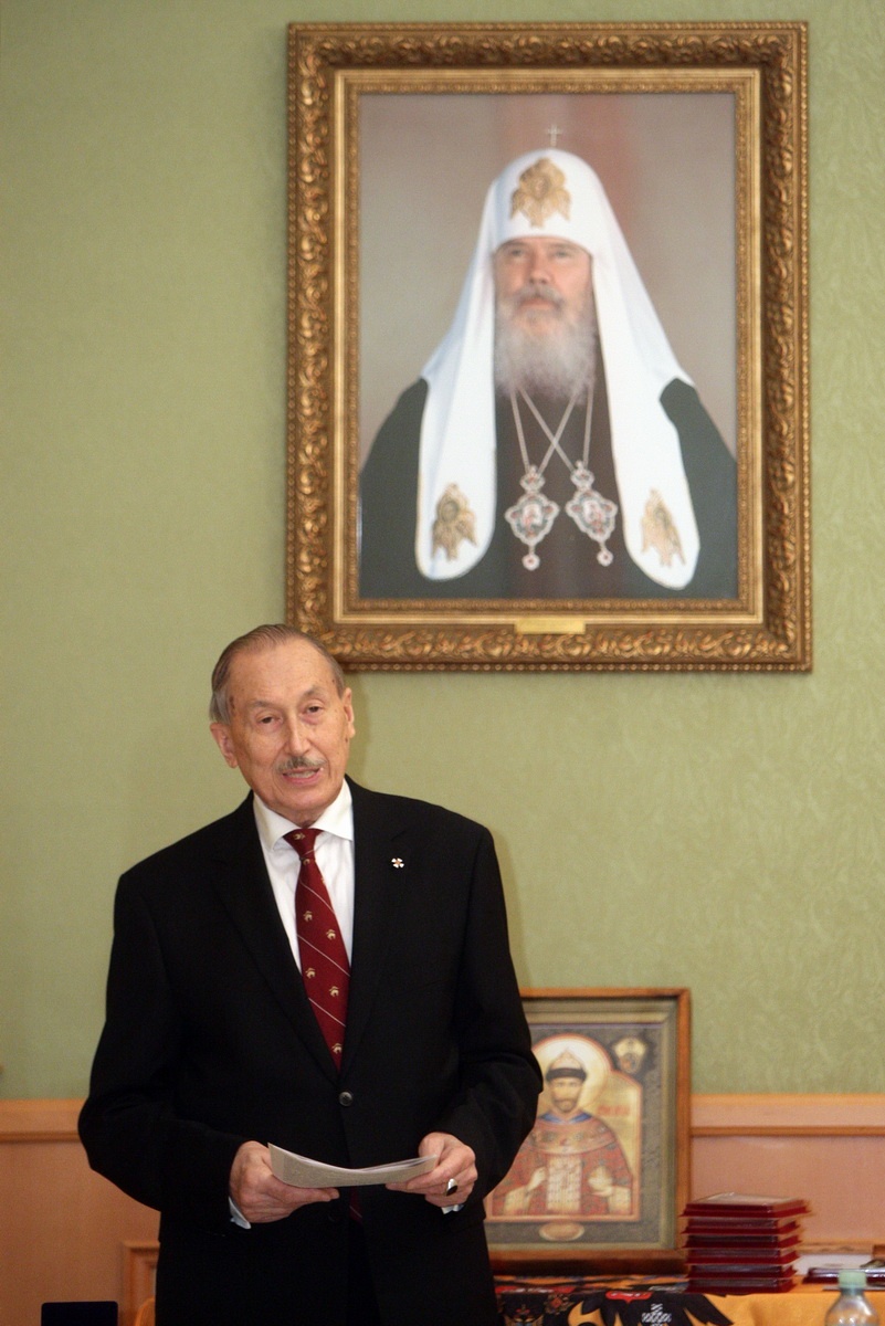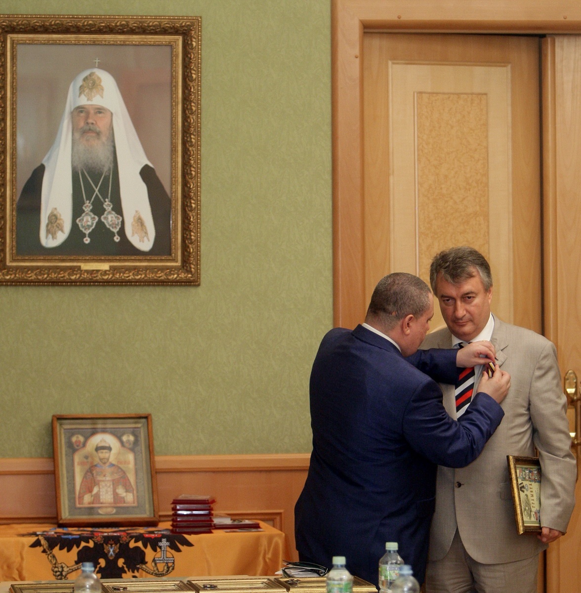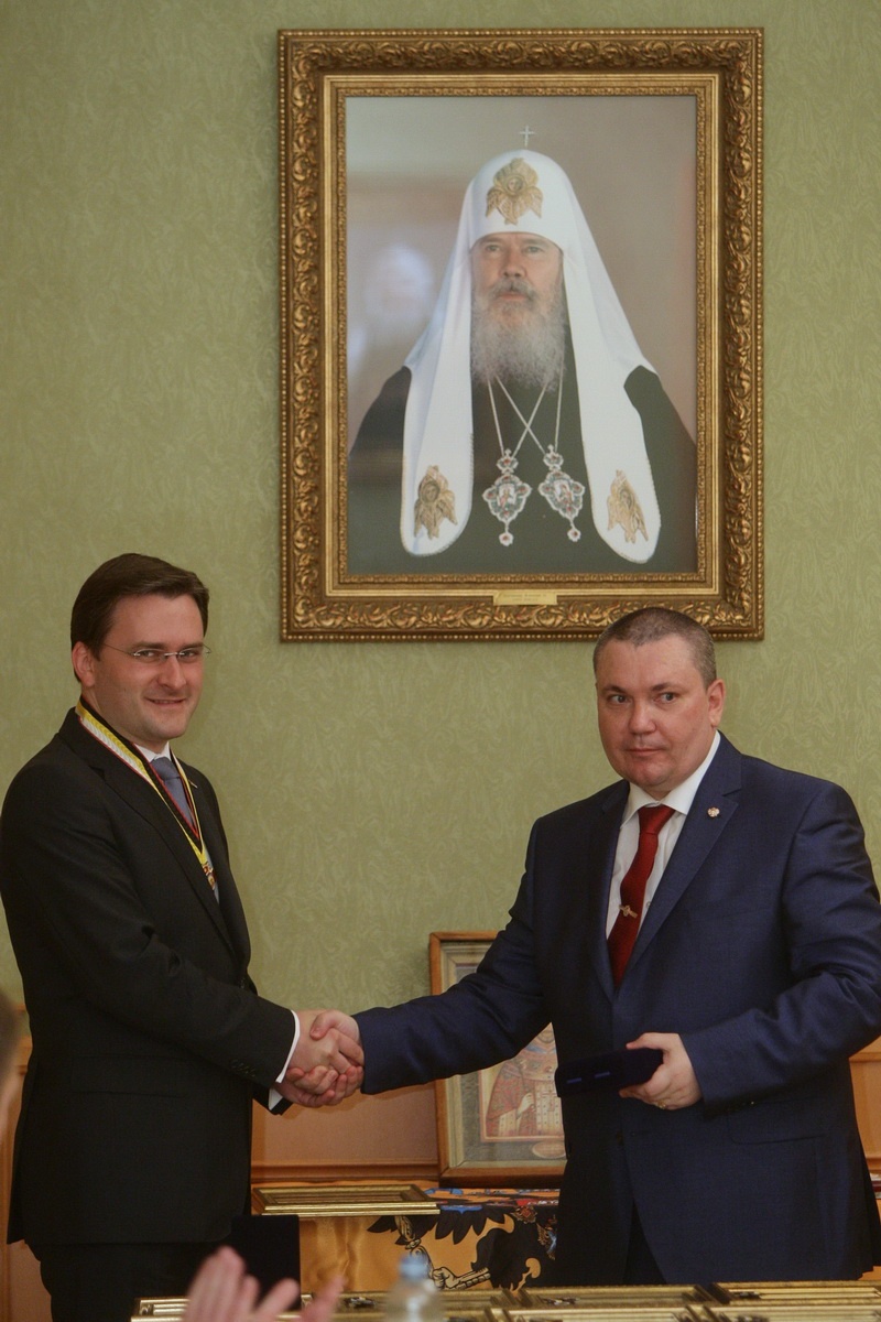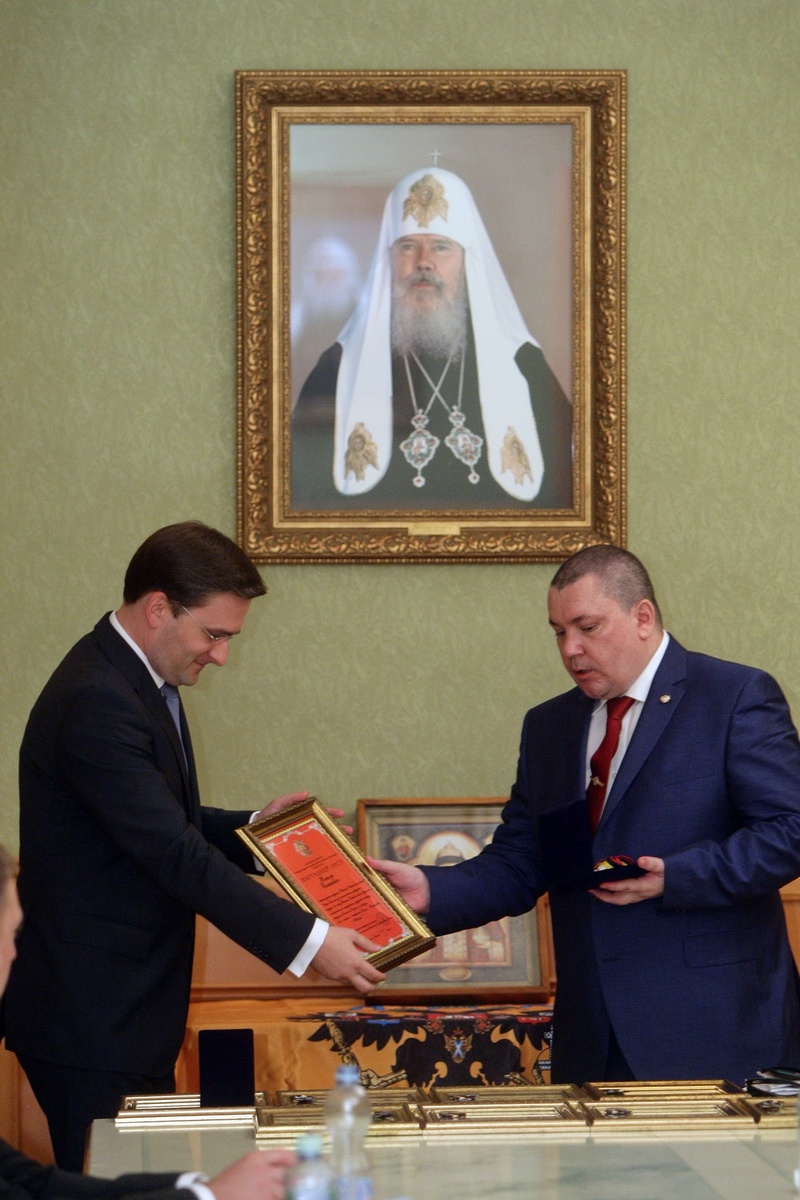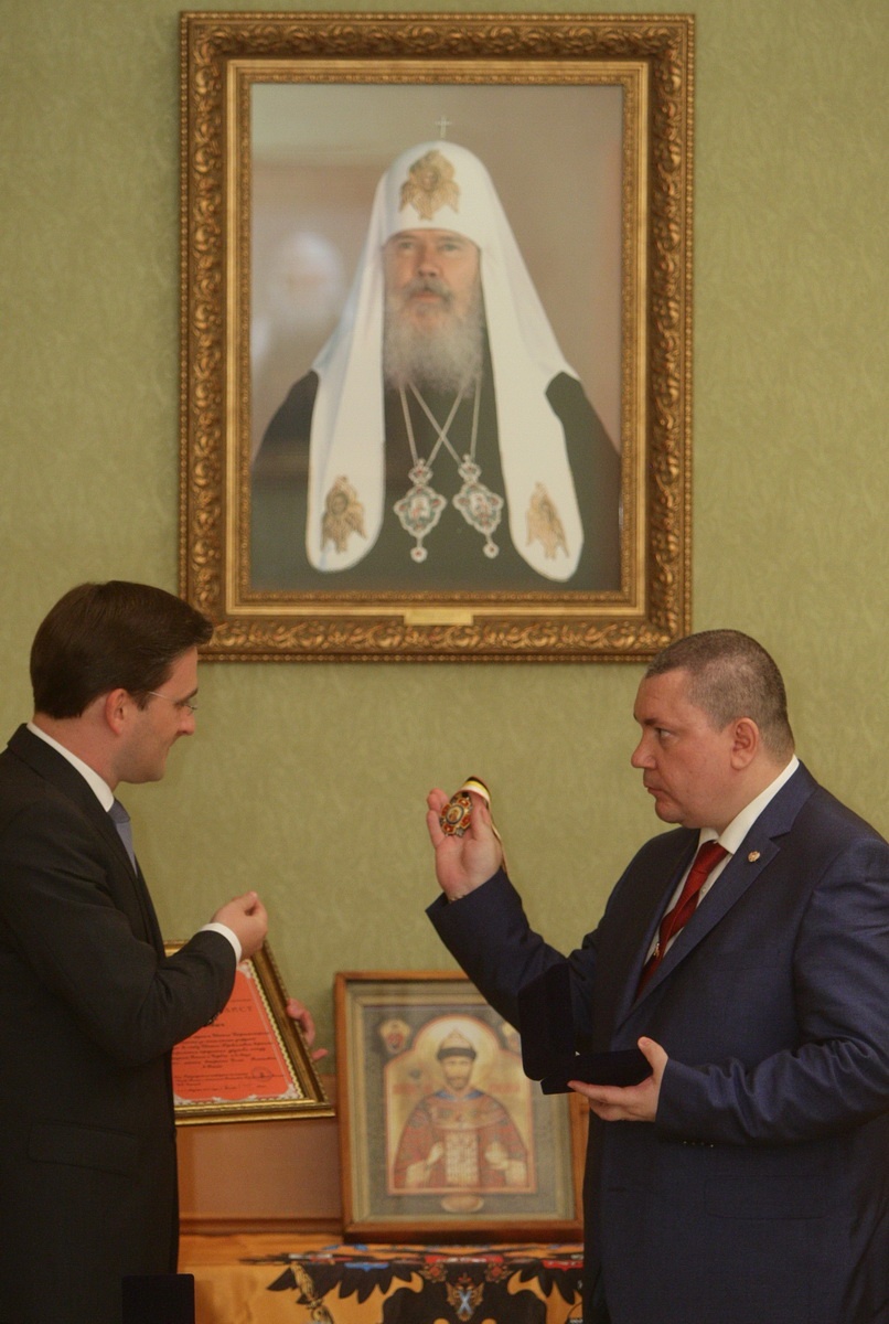 В Зеленой комнате московского Храма Христа Спасителя прошел Круглый стол, посвященный событиям Первой мировой13 августа 2015 г. в День Предпразнества Происхождения Честных Древ Животворящего Креста Господня в Зеленой Комнате Храма Христа Спасителя состоялся Круглый стол, посвященный событиям Первой мировой войны, организованный Войсковой Православной Миссией. В мероприятии приняла участие представительная делегация из Сербии. С докладом о предпосылках возникновения кровавого конфликта, уничтожившего три европейские христианские монархии и повлекшего за собою миллионы людских жертв, выступил начальник Штаба ВПМ известный писатель – историк Борис Глебович Галенин. Он подчеркнул решающую роль мировой закулисы в подготовке и развязывании войны. Затем в присутствии Чудотворной мироточивой иконы Государя Императора Николая Второго начальник Войсковой Православной Миссии Игорь Евгеньевич Смыков вручил православные награды. Орден «За Заслуги» был вручен Борису Галенину, автору многих исторических книг, рассказывающих правду о Царской России и Государе Императоре Николае Втором – «За заслуги в деле возрождения Православной Самодержавной Монархии в России». Министр юстиции Сербии г-н Никола Селакович был награжден орденом Святого Страстотерпца Царя Николая – «за многолетние усердные труды во славу Святого Православия, верность историческим традициям дружбы между народами России и Сербии и в связи с 400 – летием воцарения Дома Романовых в России». Юбилейная медаль «В память Великой войны» была вручена членам сербской делегации, среди которых были Деян Накич, зам. Министра юстиции Сербии Никола Савич, Владимир Руменич, Марко Тополич, Велемир Селякович, с российской стороны: Слепнева Ольга Валентиновна, Волкова Наталья Анатольевна, Гнидаш Сергей Алексеевич, представитель ВПМ в Словении Валиев Гела Абрекович, член Союза писателей России Копылов Александр Федорович. Особо знаменательно, что мероприятие прошло в присутствии Чудотворной иконы Царя Николая, возложенной на Императорский штандарт, где на золотом поле цветное изображение Двуглавого орла с гербами губерний и царств, входивших в состав Российской Империи. От мироточащей иконы Государя шло сильное благоухание. В этот же день участники Круглого стола посетили Троице - Сергиеву Лавру, где приложились к мощам покровителя Русского Государства Святого Преп. Сергия Радонежского. 14 августа 2015 г. Юбилейная медаль "В память Великой войны" была вручена главе Сербиягаза Душану Баятовичу.
