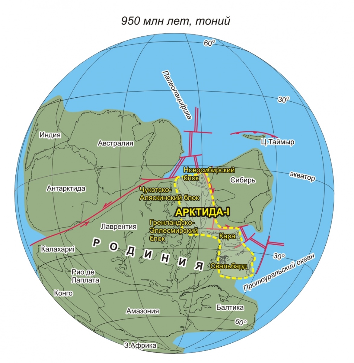Ученые проанализировали и обобщили палеомагнитные данные, собранные за 20 лет экспедиций в Арктике, прежде всего в пределах островных архипелагов Северного Ледовитого океана. Палеомагнитный метод, положенный в основу исследования, позволяет определить положение блоков земной коры в прошлом. Это возможно, благодаря измерениям характеристик древнего магнитного поля, которые способны «записываться» в горных породах в момент их образования. Поскольку палеомагнитные характеристики напрямую зависят от положения блока в пространстве, с точностью до нескольких градусов можно установить, где он находился в то или иное время. – Анализ полученных данных показал, что в геологической истории было минимум два Арктических континента, а не один, как считалось ранее. Согласно нашей модели, первый раз континент, назовем его Арктида-I, был образован миллиард лет назад. Он представлял собой часть более крупного Родинии, объединявшей все известные сегодня древние-массива континентальные блоки. Около 750 млн лет назад суперконтинент Родиния распался. Арктида-I тоже была разбита на отдельные фрагменты, которые, в основном, дрейфовали на периферии Сибирского палеоконтинента, находившегося тогда вблизи экватора. Второе рождение Арктиды произошло на рубеже мезозоя, порядка 250 млн лет назад. Это время в истории Земли Пангеи. Составные-связано с формированием другого суперконтинента элементы Арктиды-II те же, что и прежде, но их взаимная конфигурация уже иная и положение в структуре суперконтинента соответствует периферийной части, по сути, на современной Евразийской окраине, - рассказал Дмитрий Метелкин. К остаткам древнего континента сегодня относятся Земля Франца-Иосифа, архипелаг Шпицберген, шельф Карского моря, включая архипелаг Северная Земля и северное побережье полуострова Таймыр, Новосибирские острова, шельф Восточно-Сибирского, Чукотского морей вместе с континентальными территориями Чукотки и северной Аляски, островные структуры Северной Америки, включая острова Элсмир и другие вблизи Гренландии.
