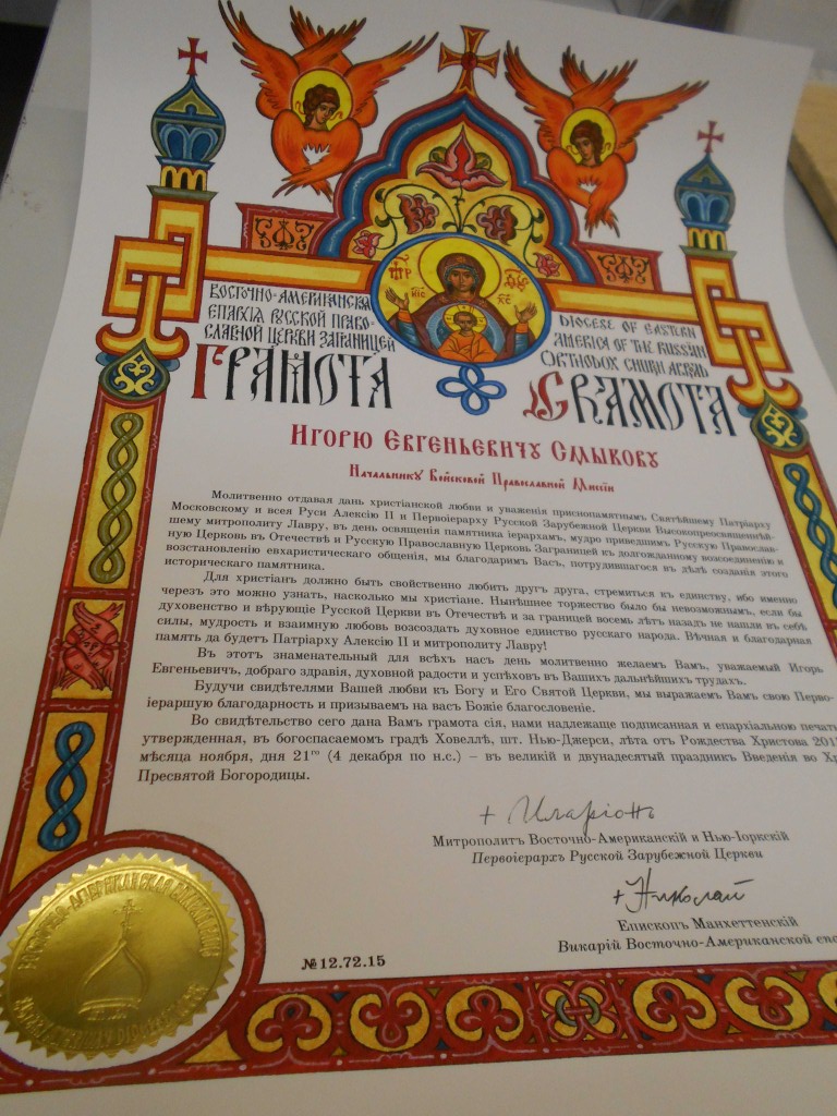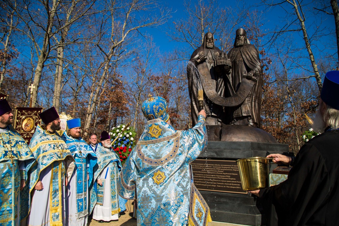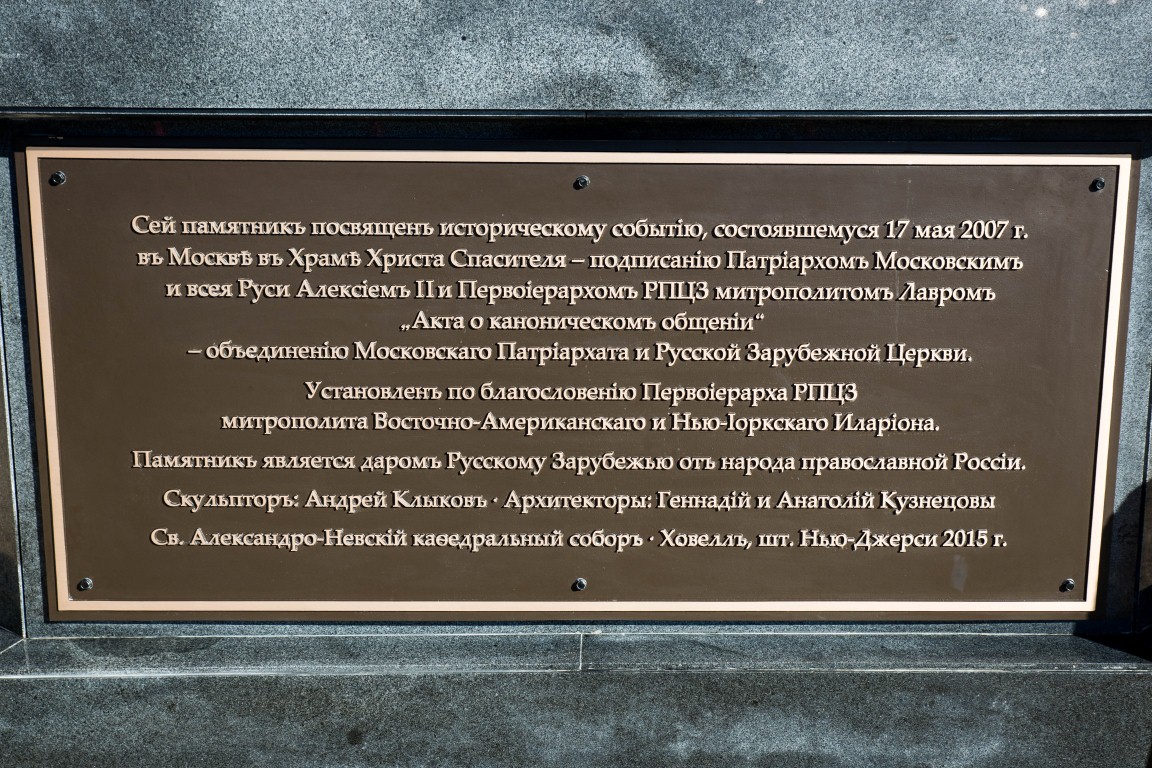 Памятник воссоединению Русской Церкви освящен в СШАВ пятницу, 4 декабря, в великий и двунадесятый праздник Введения во храм Пресвятой Богородицы в Св. Александро - Невский кафедральный собор гор. Ховелл, шт. Нью-Джерси, собралось многочисленное духовенство, верующие, гости из США и России.