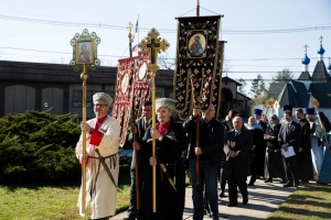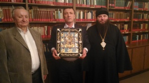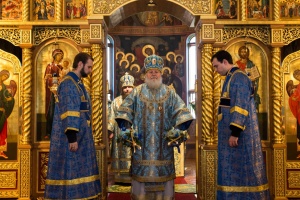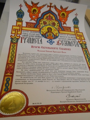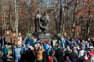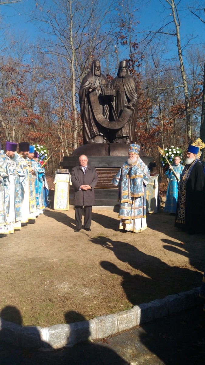 Многие, прежде чем войти в храм, проходили к памятнику двум выдающимся нашим современникам – Святейшему Патриарху Алексию II и Высокопреосвященнейшему митрополиту Лавру, который был установлен напротив кафедрального собора. В этот светлый солнечный день праздник в административном центре Восточно-Американской епархии был двойной. Праздничную Божественную литургию возглавил митрополит Восточно-Американский и Нью-Йоркский Иларион, Первоиерарх Русской Зарубежной Церкви. Его Высокопреосвященству сослужил викарий епархии епископ Манхеттенский Николай, духовенство епархии и Патриарших приходов в США. Богослужение порходило под покровом Одигитрии Русского Рассеяния – Курской Коренной иконы Божией Матери. Перед началом Литургии соборный клирик чт. Петр Лукьянов блы рукоположен во иподиакона, а алтарник Алексей Рожков удостоен права ношения ораря. Перед причащением верующих Святых Христовым Таин с проповедью к собравшимся обратился настоятель Св. Иоанно-Предтеченского собора (гор. Вашингтон, окр. Колумбия) прот. Виктор Потапов. Отец Виктор рассказал об истории светлого праздника Введения во Храм Пресвятой Богородицы, напомнив православным, что "день этот напоминает нам не только о детстве Пресвятой Богородицы, но и о том, как важно воспитывать детей и внуков при храме, потому что нет более полезного для детей места, чем дом Божий". "Если мы будем воспитывать детей с младенческого возраста, если будем преодолевать духовную расслабленность и приводить их в храм; если с молоком матери они привыкнут причащаться Святых Христовых Таин, – это будет верная защита подрастающего поколения от всех тлетворных влияний міра сего. И если они даже собъются с пути, будьте уверены, что те семена, которые были посеяны в младенчестве, дадут знать о себе впоследствии", – сказал в заключении о. Виктор. По завершении богослужения иерархи, духовенство и верующие крестным ходом с чудотворной Курской Коренной иконой прошли из собора к памятнику Воссоединению Русской Православной Церкви. Название нового памятника, "Воссоединение", выражает главное содержание заложенной в скульптурное изображение идеи – памяти об историческом событии, положившем конец периоду трагического разделения Русской Церкви в XX веке, – подписании 17 мая 2007 года в Москве Акта о каноническом общении между Русской Православной Церковью Заграницей с Русской Православной Церковью в отечестве. В композиции из бронзы запечатлены Патриарх Алексий II и митрополит Лавр, держащие в руках Храм Христа Спасителя. Скульптор памятника – Андрей Клыков, архитекторы проекта – Геннадий и Анатолий Кузнецовы. Как свитетельсвует надпись на постаменте, памятник является "даром Русскому Зарубежью от народа православной России". Символично, что точно такой же памятник был недавно установлен на территории мужского монастыря Рождества Пресвятой Богородицы "Коренная пустынь" в Курской епархии. Единственным их различием является то, что в курском варианте два предстоятеля держат в руках Курскую Коренную икону Пресвятой Богородицы, а в американском – Храм Христа Спасителя. Открывая церемонию освящения памятника, Первоиерарх Русской Зарубежной Церкви митрополит Иларион назвал композицию "замечательным памятником двум замечательным людям". "Сегодня на американской земле мы открываем пам