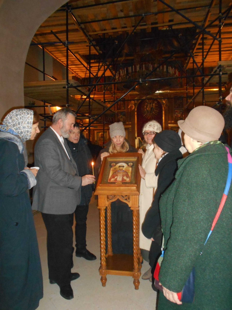 Икона была доставлена начальником Войсковой Православной Миссии (ВПМ) Игорем Евгеньевичем Смыковым и известным общественным деятелем Александром Федоровичем Чернавским. Прихожанам храма посчастливилось прикоснуться к удивительному чуду сегодняшних дней.