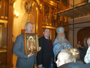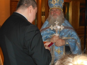 По окончании литургии Игорь Евгеньевич Смыков вручил отцу Владимиру юбилейную медаль «В память Великой войны», учрежденную Войсковой Православной Миссией по благословению Первоиерарха Русской Православной Церкви заграницей митрополита Илариона.
