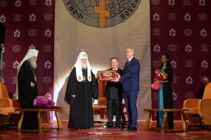 После демонстрации документального фильма, посвященного деятельности Международного фонда единства православных народов, президент организации В.А. Алексеев произнес вступительное слово и пригласил на сцену Святейшего Патриарха Кирилла для открытия торжественной церемонии.