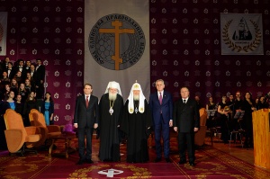 Святейший Патриарх Кирилл и В.А. Алексеев вручили дипломы и памятные знаки лауреатам 2015 года — Святейшему Патриарху Болгарскому Неофиту, Президенту Республики Сербии Томиславу Николичу, председателю Государственной Думы ФС РФ С. Е. Нарышкину.
