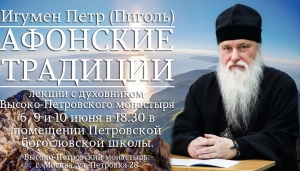 Лекции "Афонские традиции" пройдут в Высоко-Петровском монастыреМосква, 31 мая. 6, 9 и 10 июня в 18:30 в Петровской богословской школе игумен Петр (Пиголь), духовник Высоко-Петровского монастыря, расскажет об истории Святой горы и её традициях, поделится личным опытом несения послушания в Русском монастыре на Афоне, а так же ответит на Ваши вопросы.