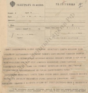 Телеграмма президиума Екатеринбургского областного совета рабоче-крестьянского правительства председателю Совнаркома Ленину и председателю ЦИК Свердлову