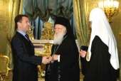 Состоялась встреча Президента России Д.А. Медведева со Святейший Патриархом Константинопольским Варфоломеем и Святейшим Патриархом Московским и всея Руси Кириллом25 мая 2010 года в Кремле состоялась встреча Святейшего Патриарха Константинопольского Варфоломея и Святейшего Патриарха Московского и всея Руси Кирилла с Президентом Российской Федерации Д.А. Медведевым. ![]() Приветствуя Предстоятеля Константинопольской Православной Церкви, глава Российского государства сказал: «Ваше Святейшество, я очень рад Вас приветствовать в Кремле. Это знаменательное событие — визит Вашего Святейшества в нашу страну и, безусловно, это способствует укреплению диалога, который всегда связывал две сестринские Церкви. Для России это особенно важно с учетом того, что Россия в значительной степени — страна, в которой большая часть населения является православной по своему вероисповеданию, поэтому мы очень внимательно следим за Вашим приездом и за тем, что сейчас происходит. Святейший Патриарх Кирилл в прошлом году посещал Константинопольский Патриархат и был Вашим гостем; в этом году Вы у нас в гостях, и конечно, это имеет большое значение для всего православного мира. В России за последнее время произошло много изменений, живыми свидетелями которых являемся все мы, и я очень рад, Ваше Святейшество, что Вы сможете ознакомиться с теми, на мой взгляд, благоприятными изменениями, которые происходят и в жизни нашей страны, в жизни российского общества, и в диалоге, который существует внутри нашей страны — в диалоге Русской Православной Церкви и государства. Только в результате такого диалога можно решать очень сложные задачи, которые стоят сегодня перед нашим государством, да и те задачи, которые вытекают из очень сложной экономической ситуации, сложившейся в мире в результате финансового кризиса. Именно поэтому мы так ценим тот конструктивный и полноценный диалог, который сложился за последнее время у нас с Русской Православной Церковью. Позвольте выразить, Ваше Святейшество, надежду, что в ходе своего визита Вы сможете лучше ознакомиться и с жизнью нашей страны, и с современной жизнью Русской Православной Церкви». Затем к Президенту России обратился Святейший Патриарх Константинопольский Варфоломей: «Ваше Превосходительство, я хотел бы выразить теплую благодарность Вам лично за приглашение, за эту Вашу встречу со мной и со Святейшим Патриархом Кириллом. Я и мои сопровождающие очень рады, что в эти дни находимся в России, будучи гостями Его Святейшества Святейшего Патриарха Кирилла. Мы очень рады, что наш визит совпал с празднованием Дней славянской письменности и культуры, а также с Днем тезоименитства Святейшего Патриарха Кирилла, которого мы принимали с большой любовью и уважением в нашем Патриархате. Мы благодарим Вас за то, что праздник славянской письменности является в России государственным. Мы радуемся тем добрым отношениям и сотрудничеству, которые существуют между государством и Русской Церковью. Российское руководство и руководство Русской Православной Церкви пишут новые страницы истории. Русское общество утверждается на его традиционных нравственных ценностях, на христианских идеалах — это лучший залог, лучшая гарантия будущего народа. Благодарю Вас, господин Президент». К Д.А. Медведеву обратился Святейший Патриа