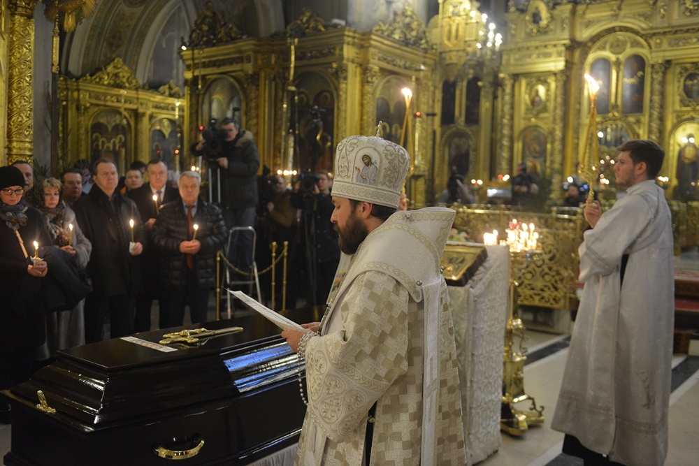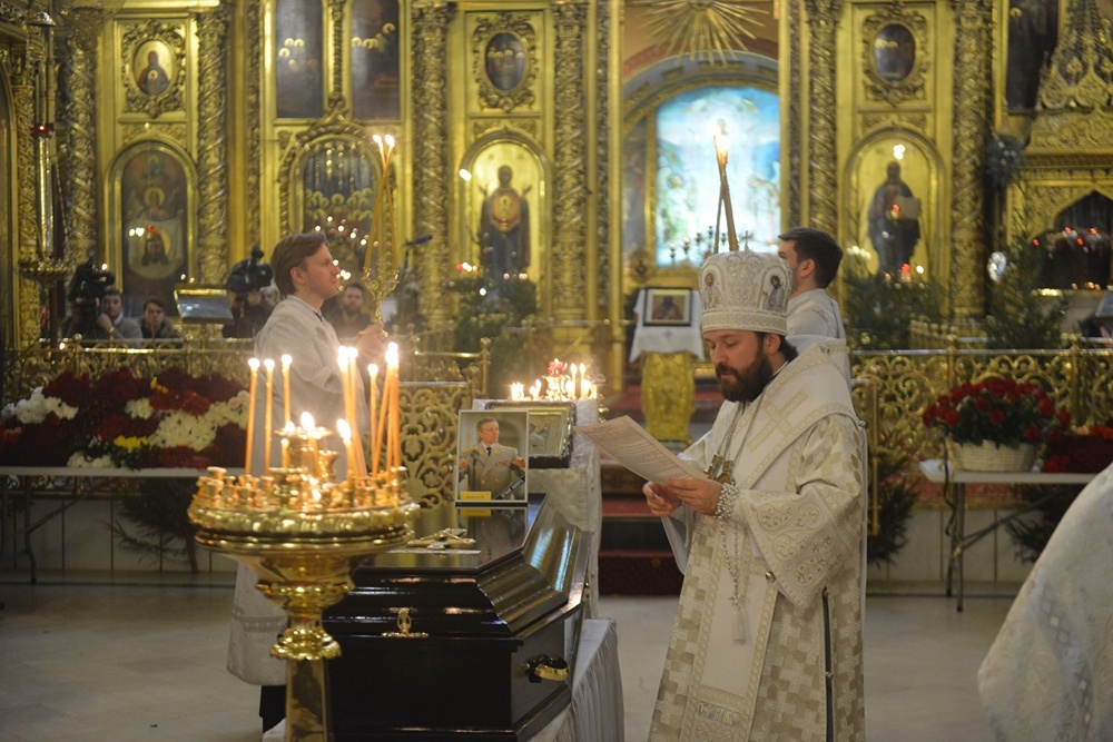 Перед началом чина отпевания митрополит Иларион от имени Святейшего Патриарха Московского и всея Руси Кирилла и от себя лично выразил сердечное соболезнование родственникам усопшего и всем, кто собрался в Богоявленском Патриаршем соборе, чтобы проводить его в последний путь.
