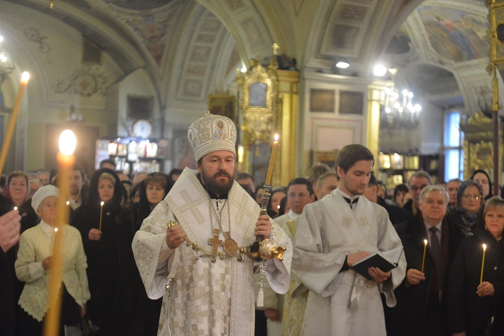 На отпевании митрополиту Волоколамскому Илариону сослужили настоятель Богоявленского собора в Елохове протоиерей Александр Агейкин и клирики кафедрального храма, проректор Общецерковной аспирантуры и докторантуры имени равноапостольных Кирилла и Мефодия иеромонах Иоанн (Копейкин), секретарь председателя ОВЦС священник Александр Карзан.