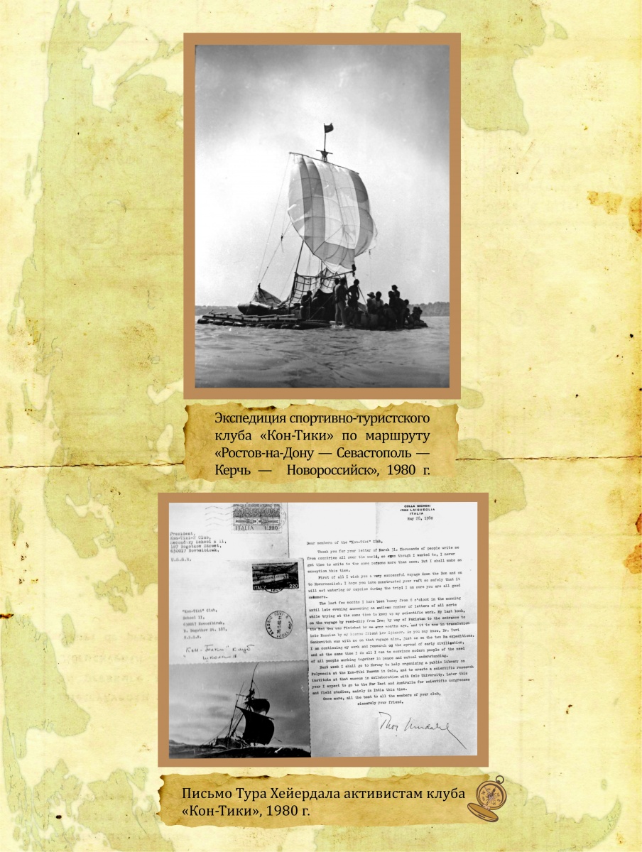 Еще один сюжет фотографий – экспедиции туристского клуба «Кон-Тики», образованного в 1975 году учителем физкультуры школы №11 Олегом Маркиным. Участники экскурсии увидят, в каких путешествиях побывали команды клуба, которые путешествуют на собственноручно сделанных плотах и узнают значение слов «Кон-Тики». Клуб назван так в честь плота, на котором в 1947 году совершил путешествие норвежский исследователь Тур Хейердал. Хейердал был почётным президентом новосибирского клуба «Кон-Тики». Каждый посетитель сможет прочитать письмо Тура Хейердала, написанное участникам клуба.