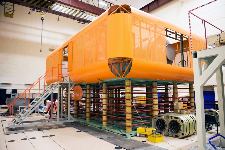 В высоковольтном инжекторе ИЯФ СО РАН отрицательные ионы водорода ускоряются до энергии 1 миллион электрон-вольт, а затем с высокой эффективностью преобразуются в пучок быстрых атомов. По величине инжектор сравним с двухэтажным зданием.